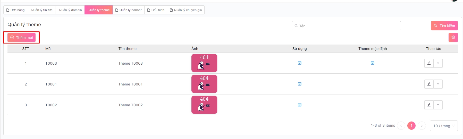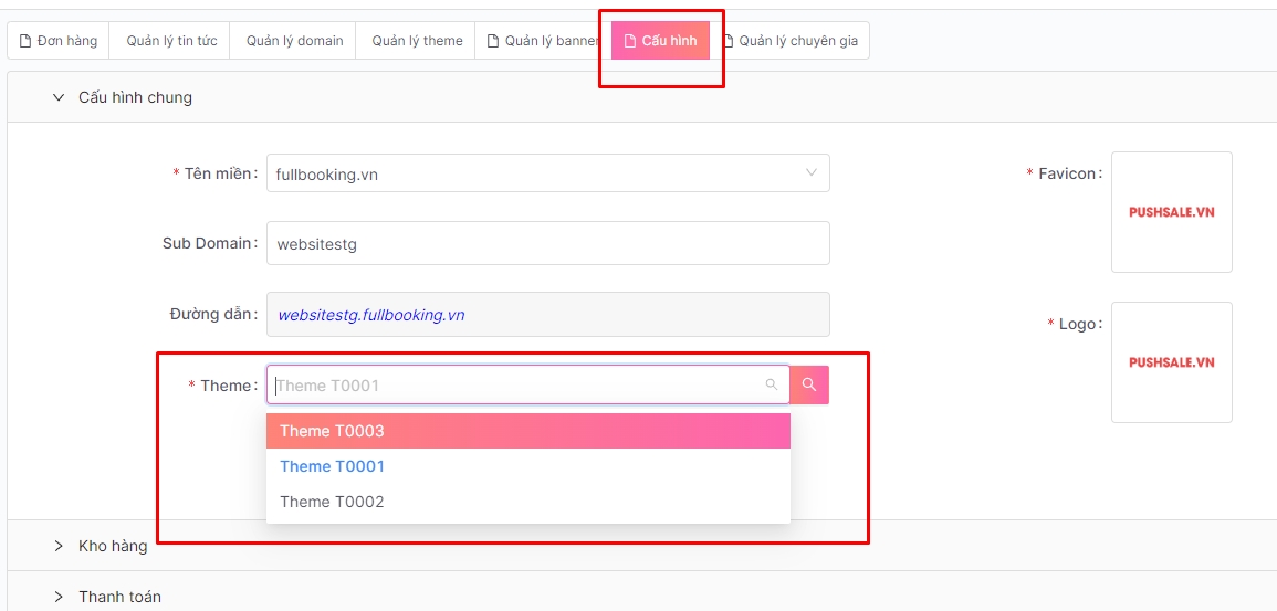 Theme có trạng thái "Hoạt động" sẽ hiển thị tại màn Cấu hình website
