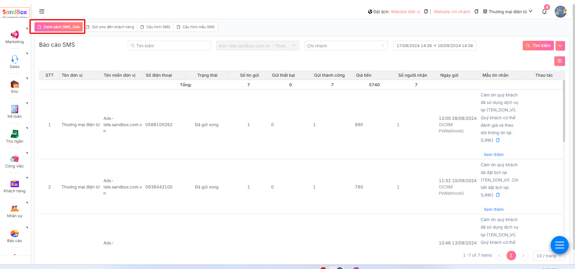1. Sau khi đăng nhập thành công, tại thanh menu chọn **Marketing => Quản lí SMS và zalo OA => Danh sách SMS, Zalo**