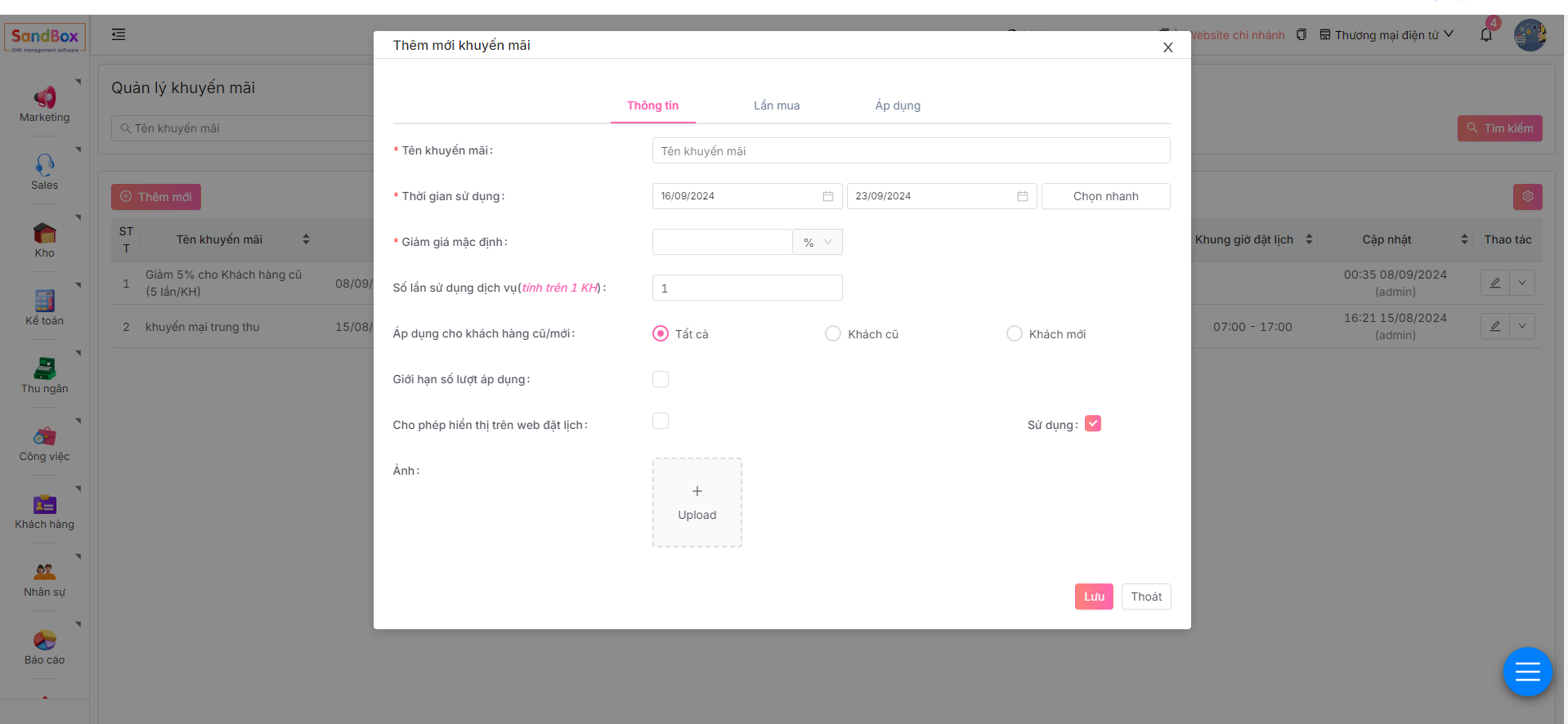 * **Cho phép hiển thị trên web đặt lịch**: Giúp khách hàng xem được khuyến mại của doanh nghiệp khi đặt lịch trên web