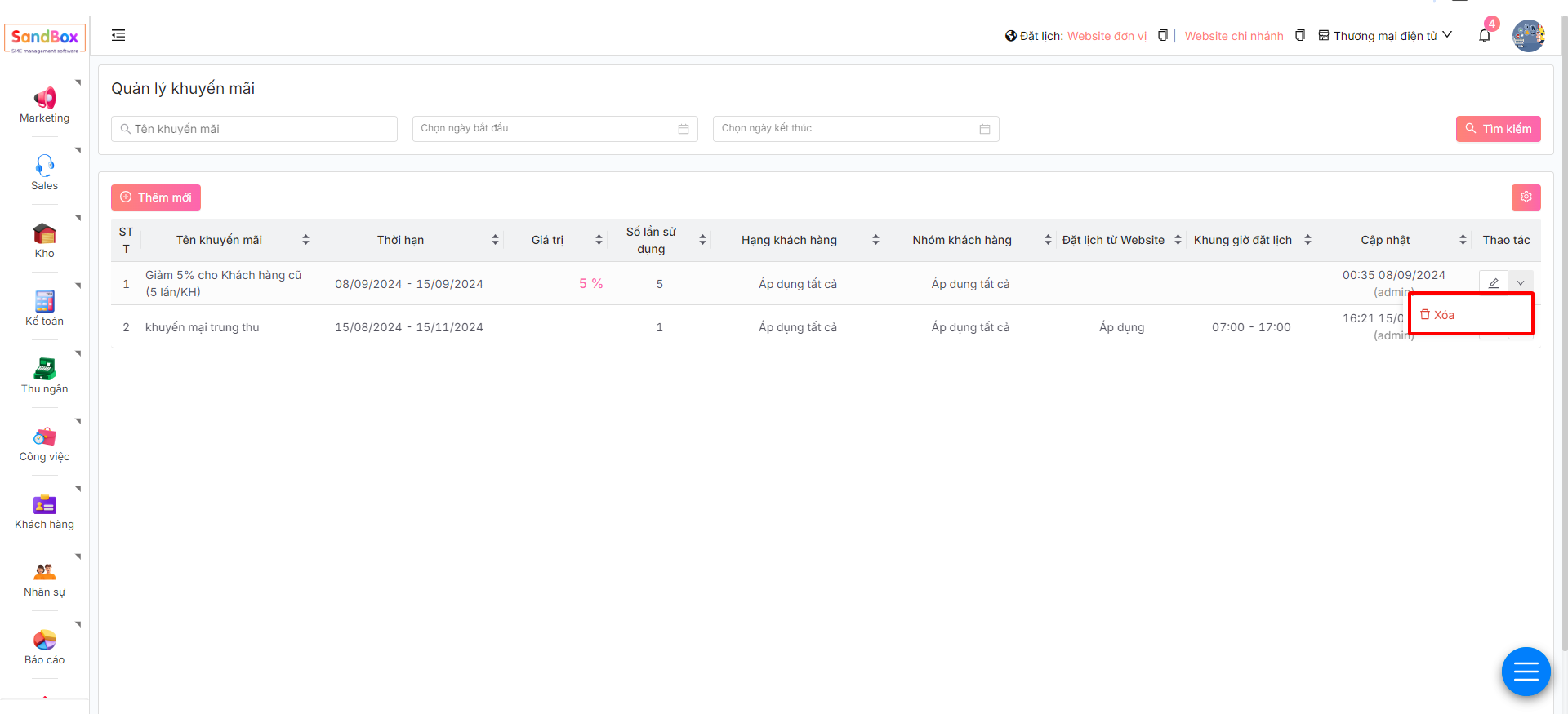 3. Muốn xóa khuyến mại bất kì, di chuột vào **Mũi tên** ở cột **Thao tác** và nhấn nút **Xóa**