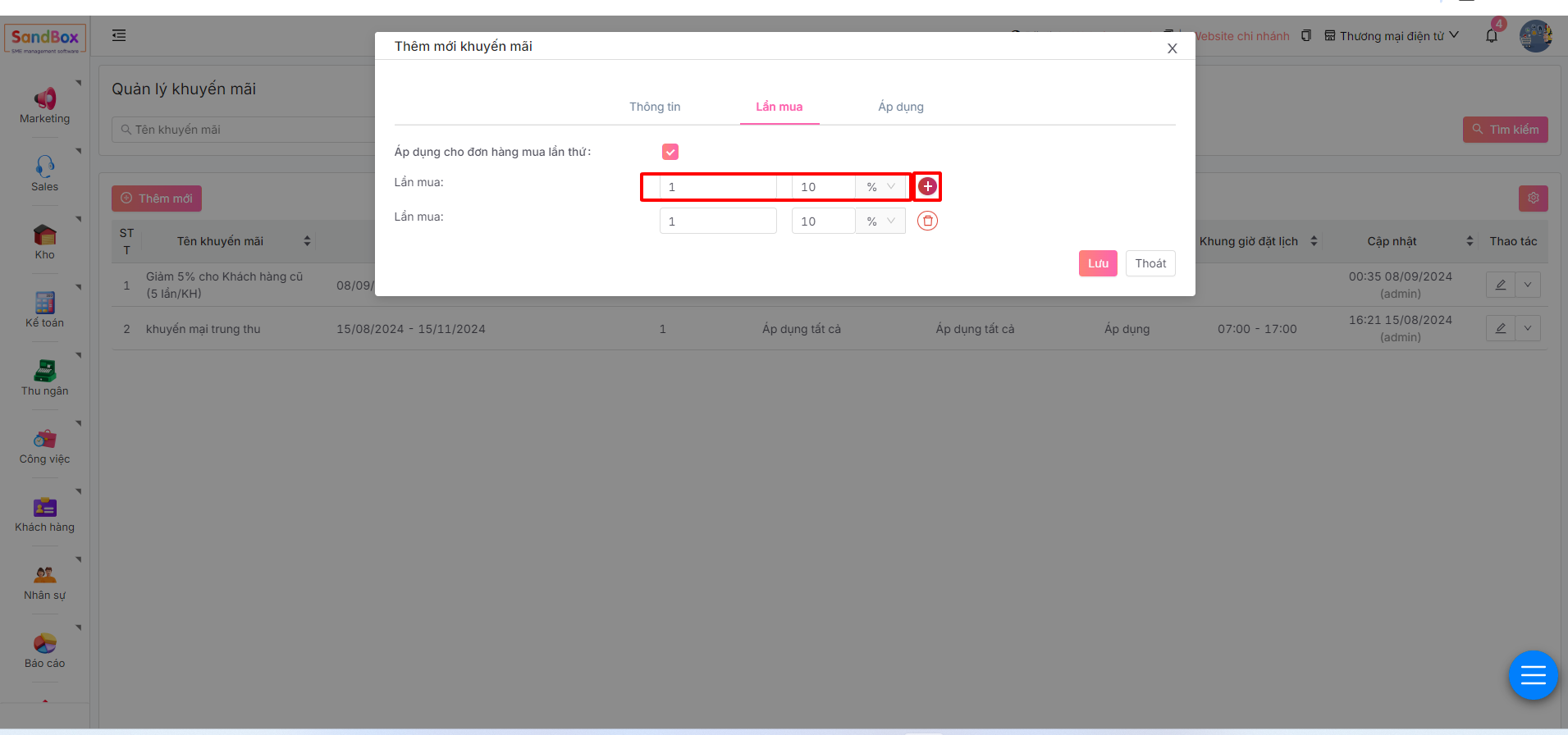 **Lưu ý:** Nhấn nút **Dấu cộng** để thêm lần mua khác muốn áp dụng khuyến mại