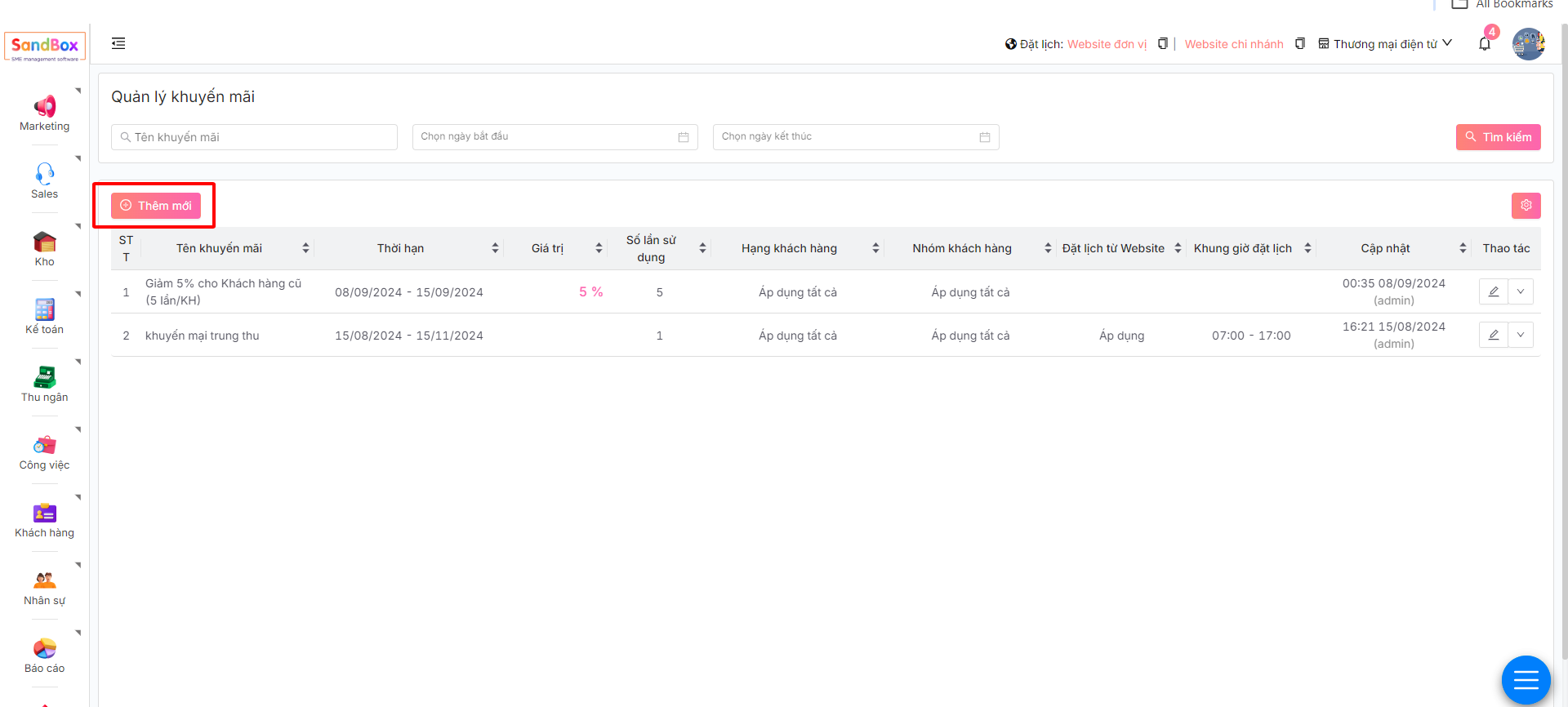 1. Nhấn nút **Thêm mới** để tạo khuyến mại