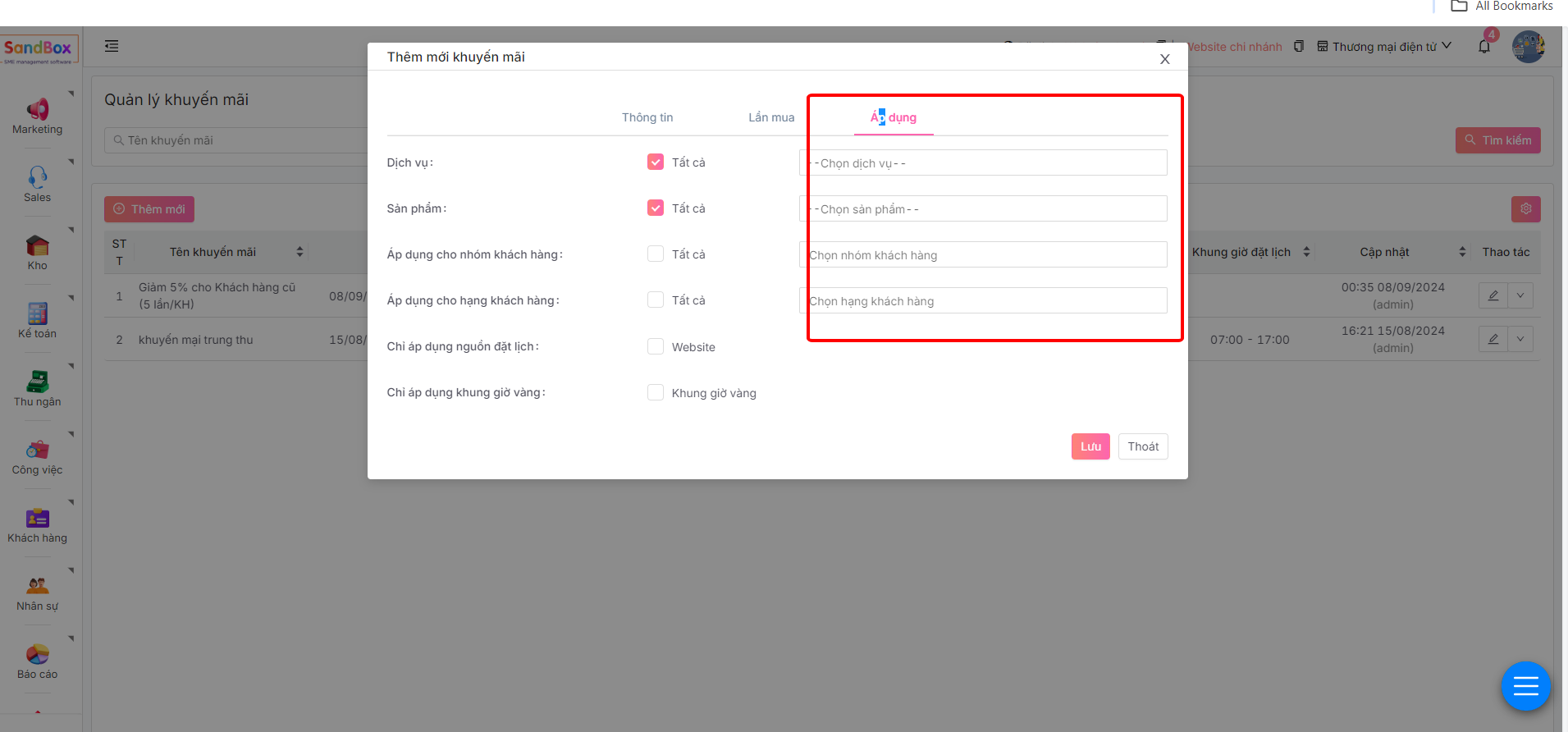 * **Áp dụng cho khách hàng cũ/mới**: Chọn đối tượng khách được sử dụng khuyến mại