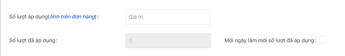Số lượt áp dụng(tính trên đơn hàng): nhập số lượt khuyến mại được sử dụng theo đơn&#x20;