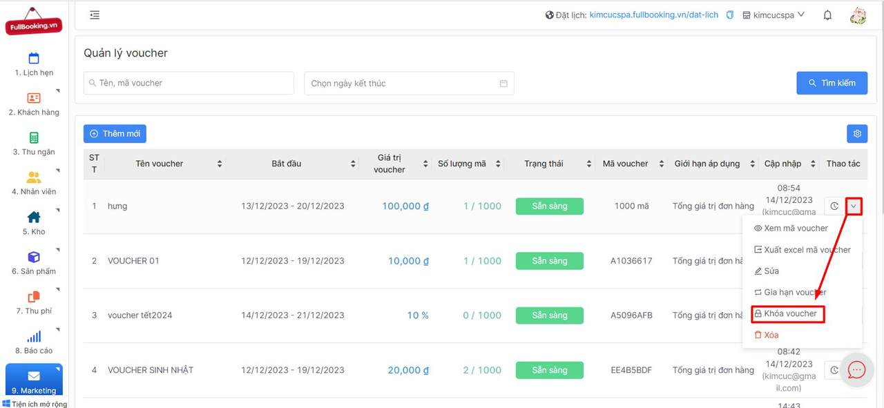 Sau khi thêm voucher thành công, bạn có thể thực hiện các thao tác hỗ trợ như xem, sửa, xóa hay khóa voucher,vv... Điều này giúp bạn thuận lợi hơn trong việc quản lý và điều chỉnh voucher theo nhu cầu