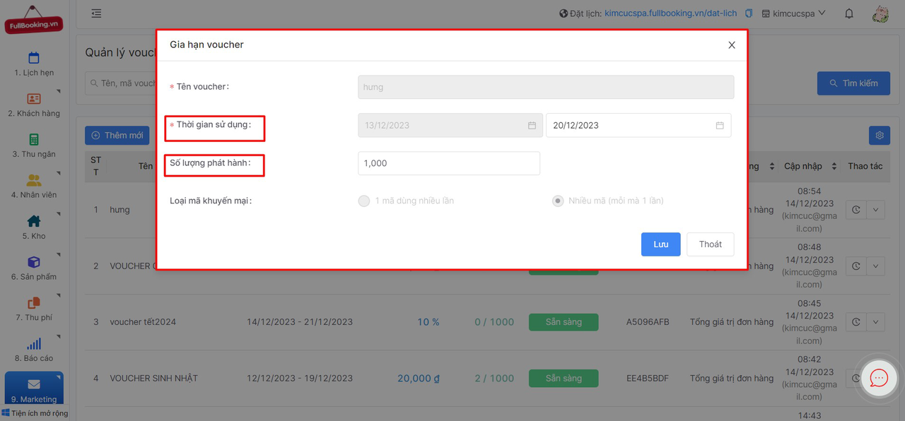 Màn hình hiển thị form Gia hạn voucher tại đây bạn có thể điều chỉnh thời gian sử dụng và số lượng phát hành của voucher.