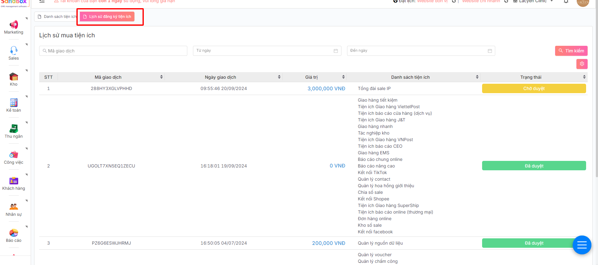 Tại màn hình hiển thị đầy đủ các trường thông tin : **Mã giao dich , ngày giao dịch, giá trị, danh sách tiện ích và trạng thái**&#x20;