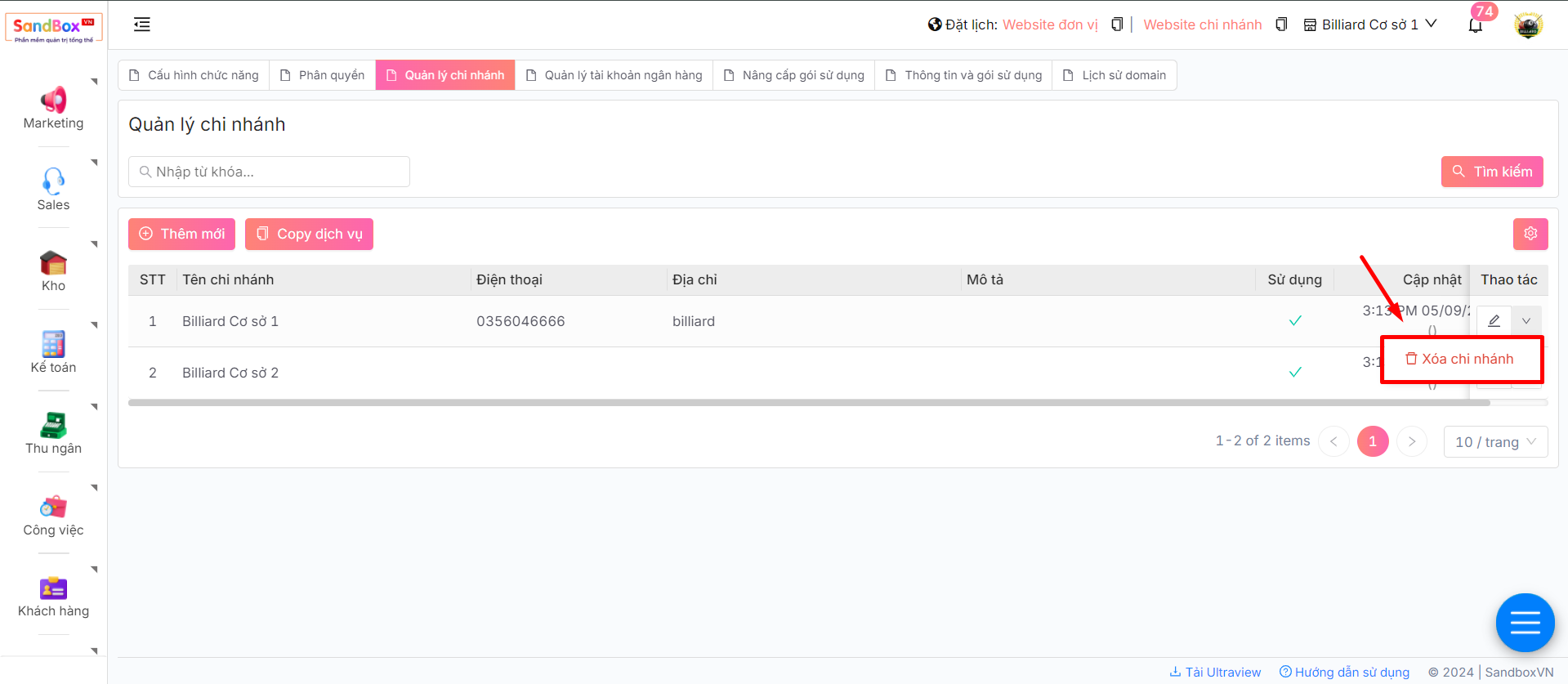 5. Di chuột vào nút **Mũi tên** chọn **Xóa** cùng dòng với chi nhánh muốn thao tác để xóa