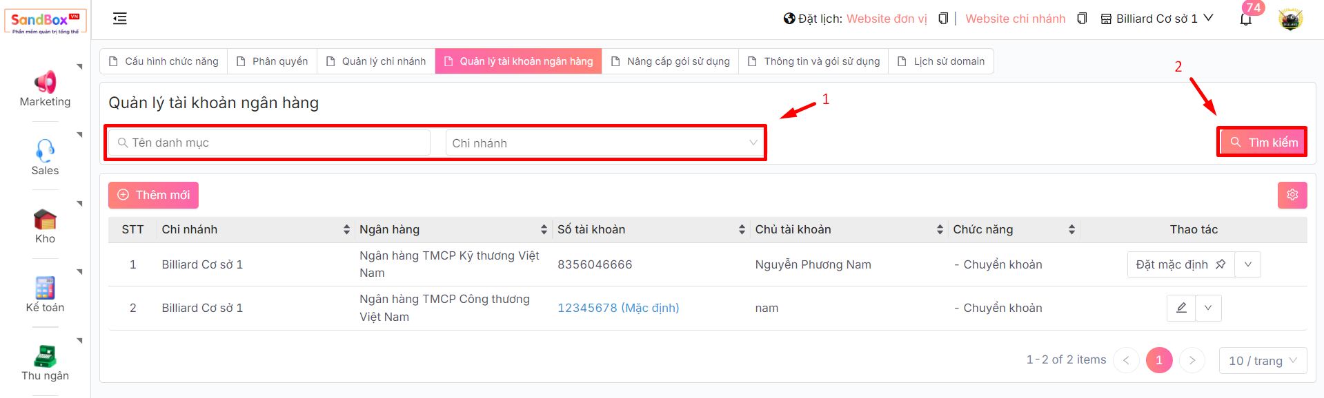 Ngoài ra, để thuận tiện quản lý và kiểm soát, bạn có thể **tìm kiếm** tài khoản theo **tên** hoặc **chi nhánh** để lọc kết quả.