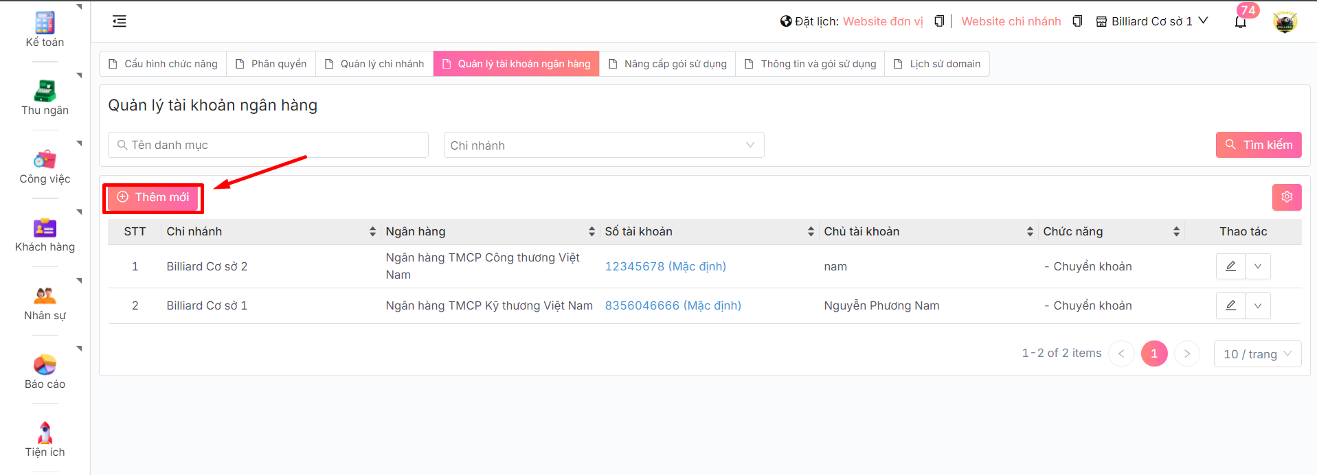 * Bạn có thể **sửa** hoặc **xóa** tài khoản và sửa nhanh lại mặc định làm tài khoản chính khi ấn <img src="https://46536393-files.gitbook.io/~/files/v0/b/gitbook-x-prod.appspot.com/o/spaces%2FKnaMljuquxKOnflZEqLy%2Fuploads%2FlHNG6acJdA43jphxvm3d%2Fimage.png?alt=media&#x26;token=91070653-1290-469b-8781-ab131b20de9e" alt="" data-size="line">