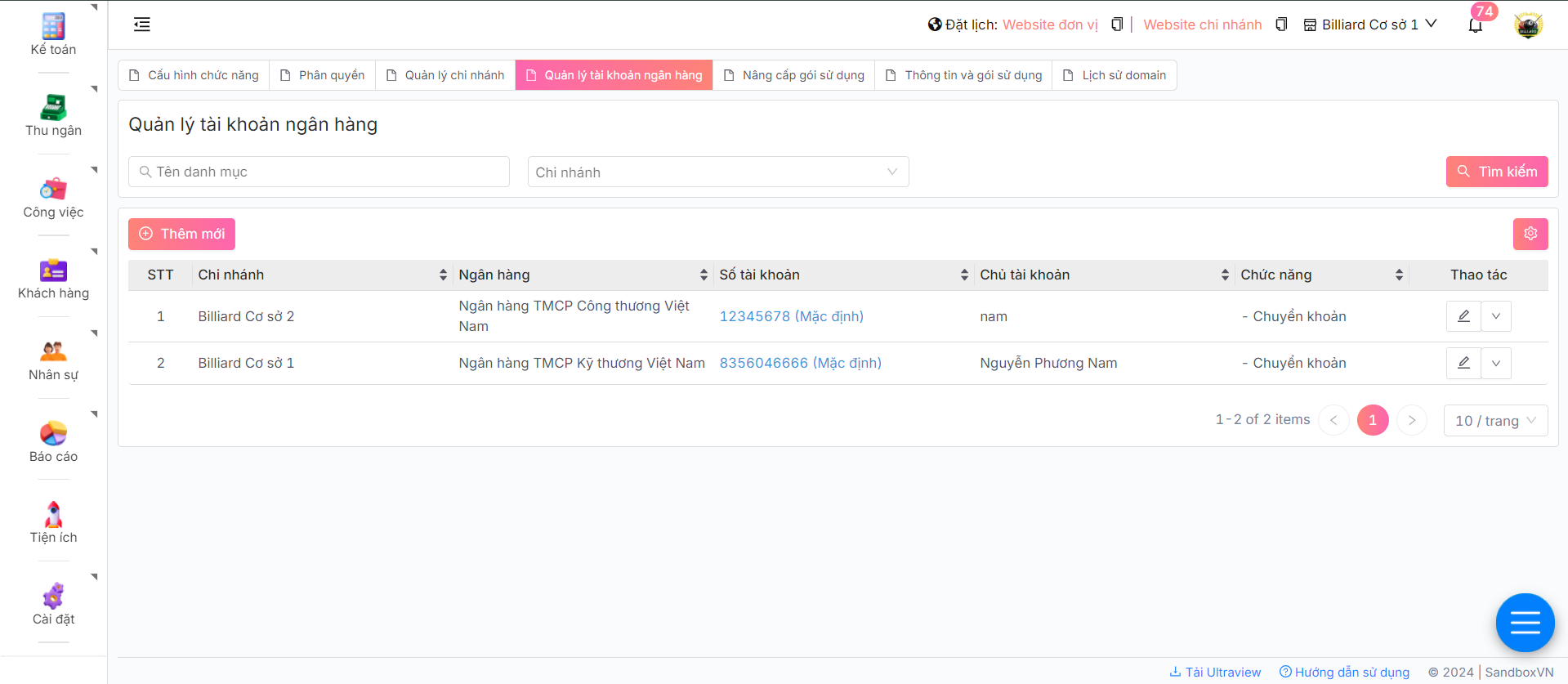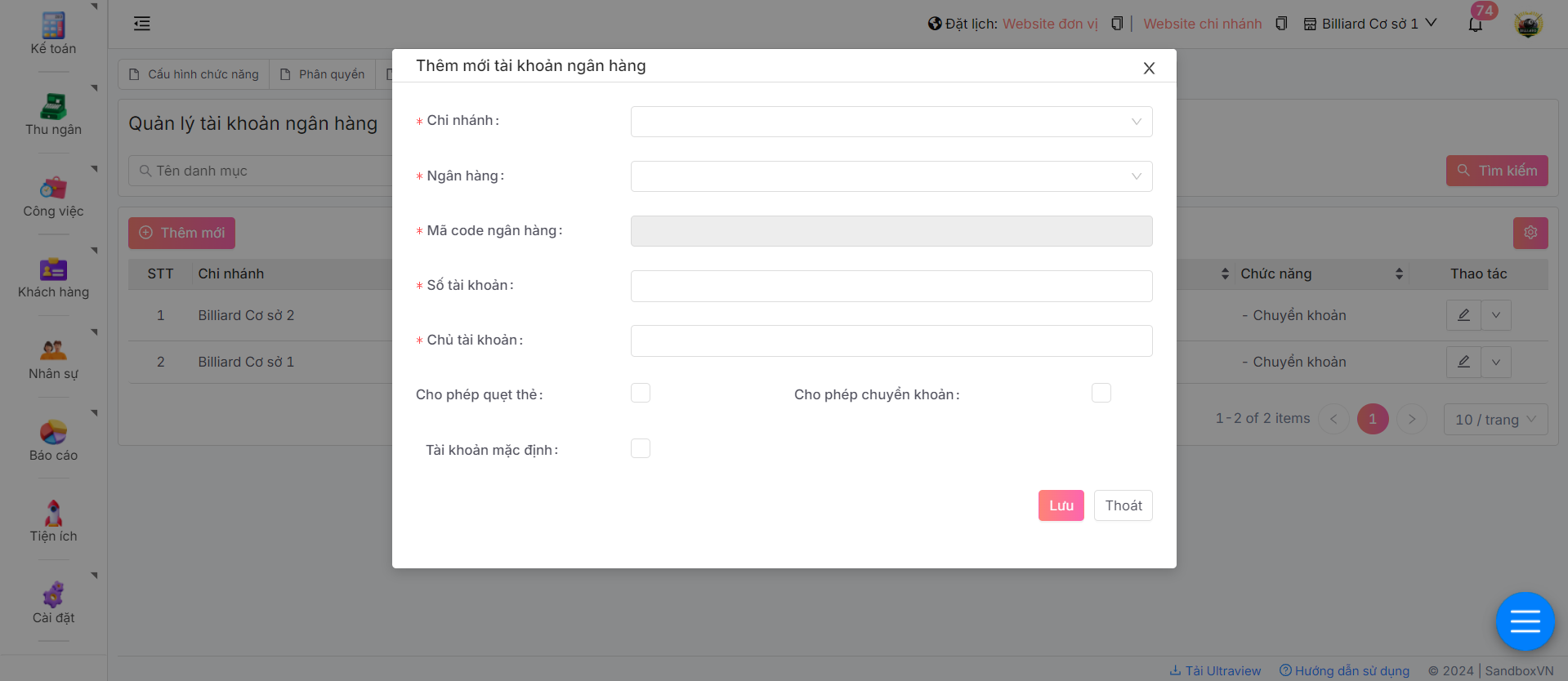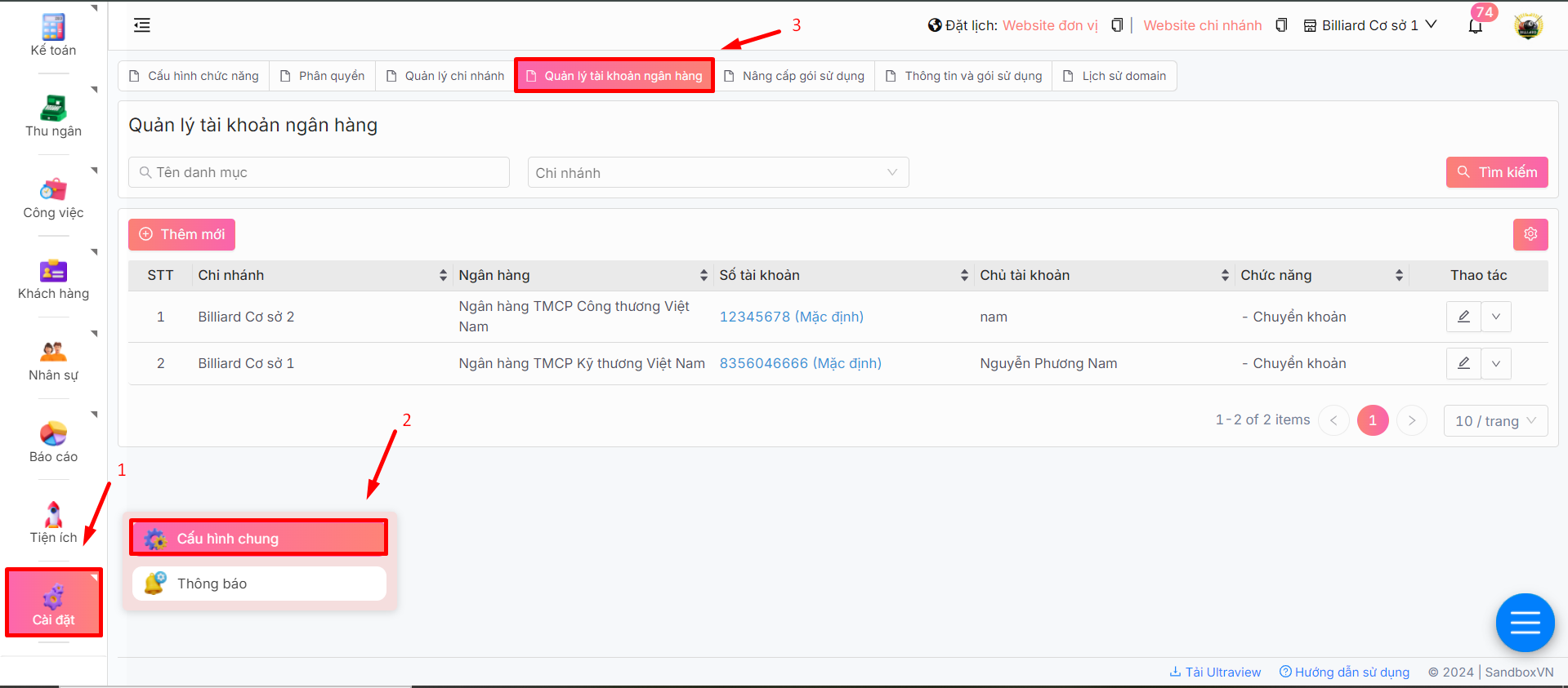 Sandbox mang đến tính năng quản lý tài khoản ngân hàng, giúp chủ doanh nghiệp thêm các tài khoản ngân hàng dùng trong thu ngân khi KH chọn thanh toán bằng phương thức chuyển khoản, quẹt thẻ