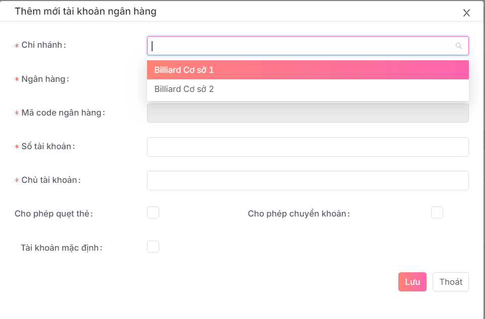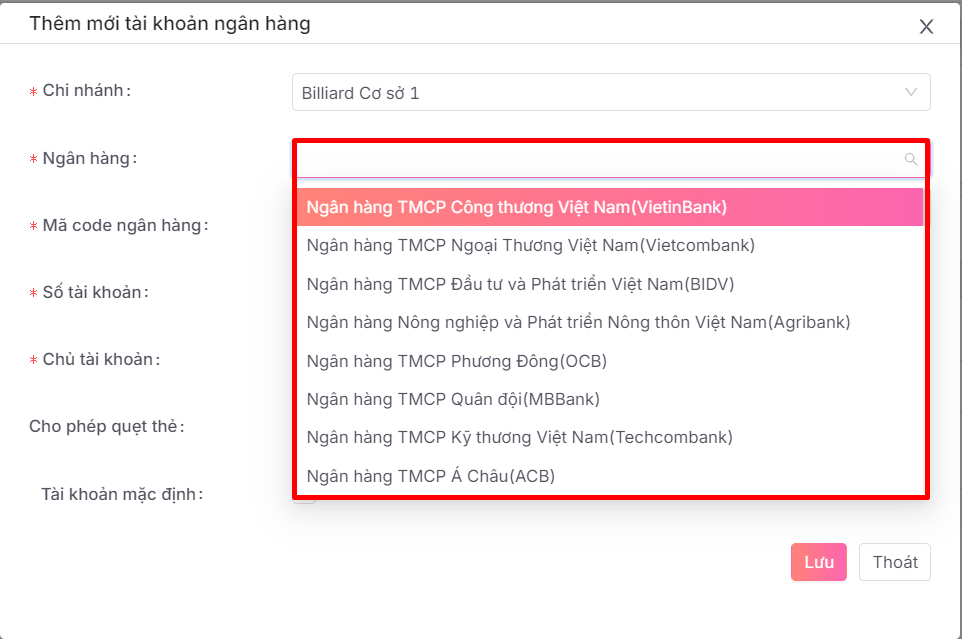 * Ngân hàng: Chọn ngân hàng cho tài khoản thêm.