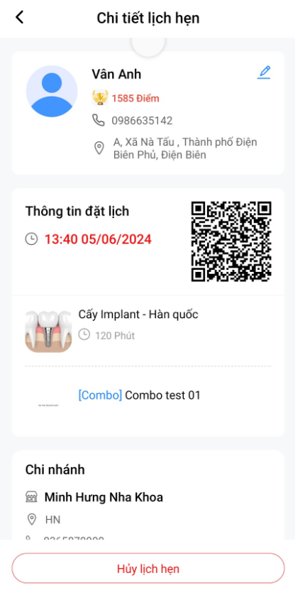 Khách hàng có thể xem chi tiết lịch hẹn, hủy lịch hẹn nếu không có nhu cầu đặt lịch