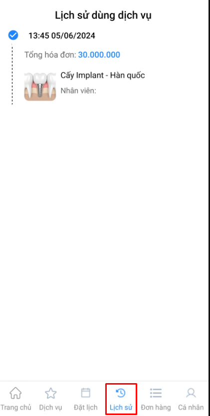 Đăng nhập vào Customer app -> Tab Lịch sử bên dưới
