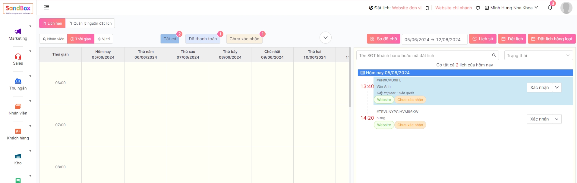 Sau khi khách hàng đặt lịch qua customer app thành công, thông tin đặt lịch sẽ hiển thị dữ liệu lên trang web đơn vị ở màn quản lý lịch hẹn