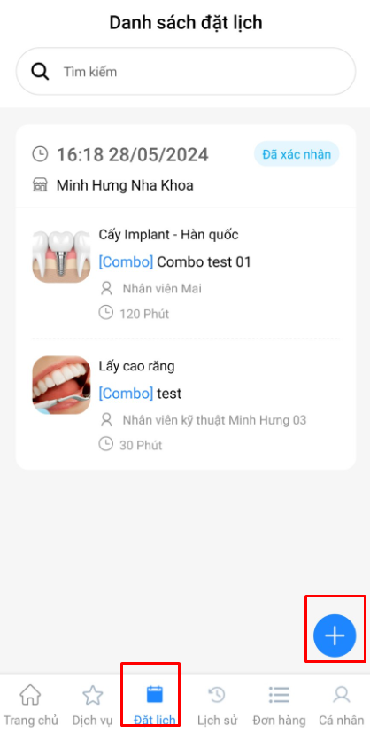 Đăng nhập vào Customer app -> Chọn Tab Đặt lịch bên dưới