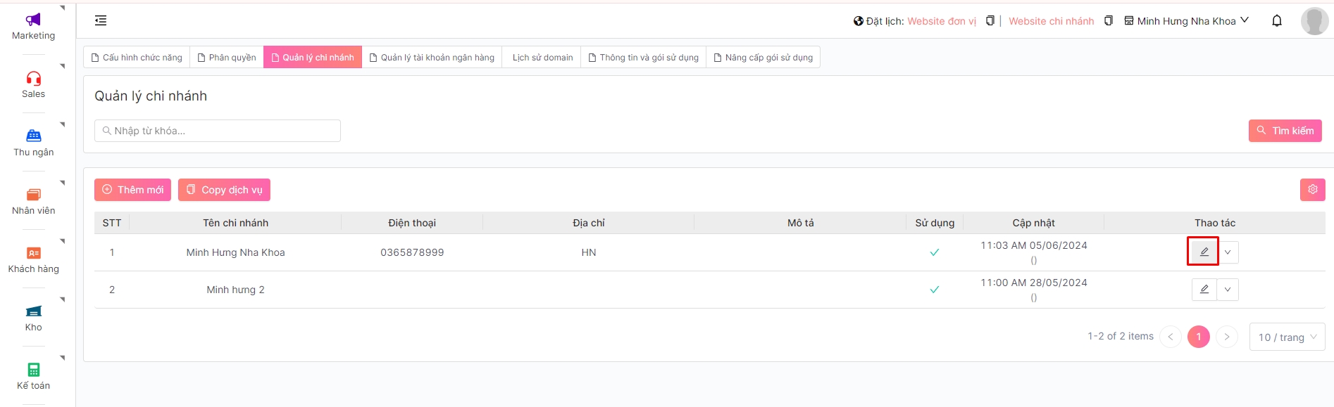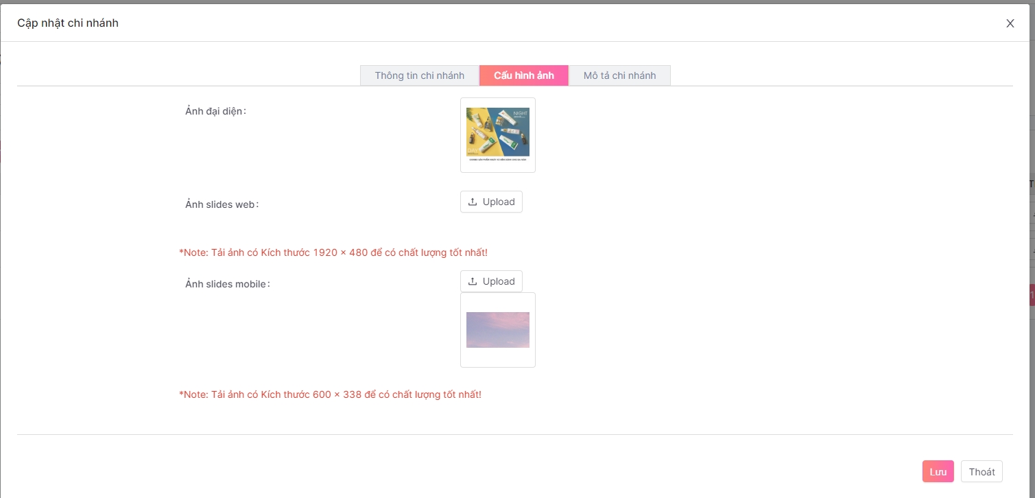 click vào sửa chi nhánh & và nhập các thông tin cần thiết lập: Thông tin chi nhánh, Cấu hình hình ảnh, Mô tả chi nhánh