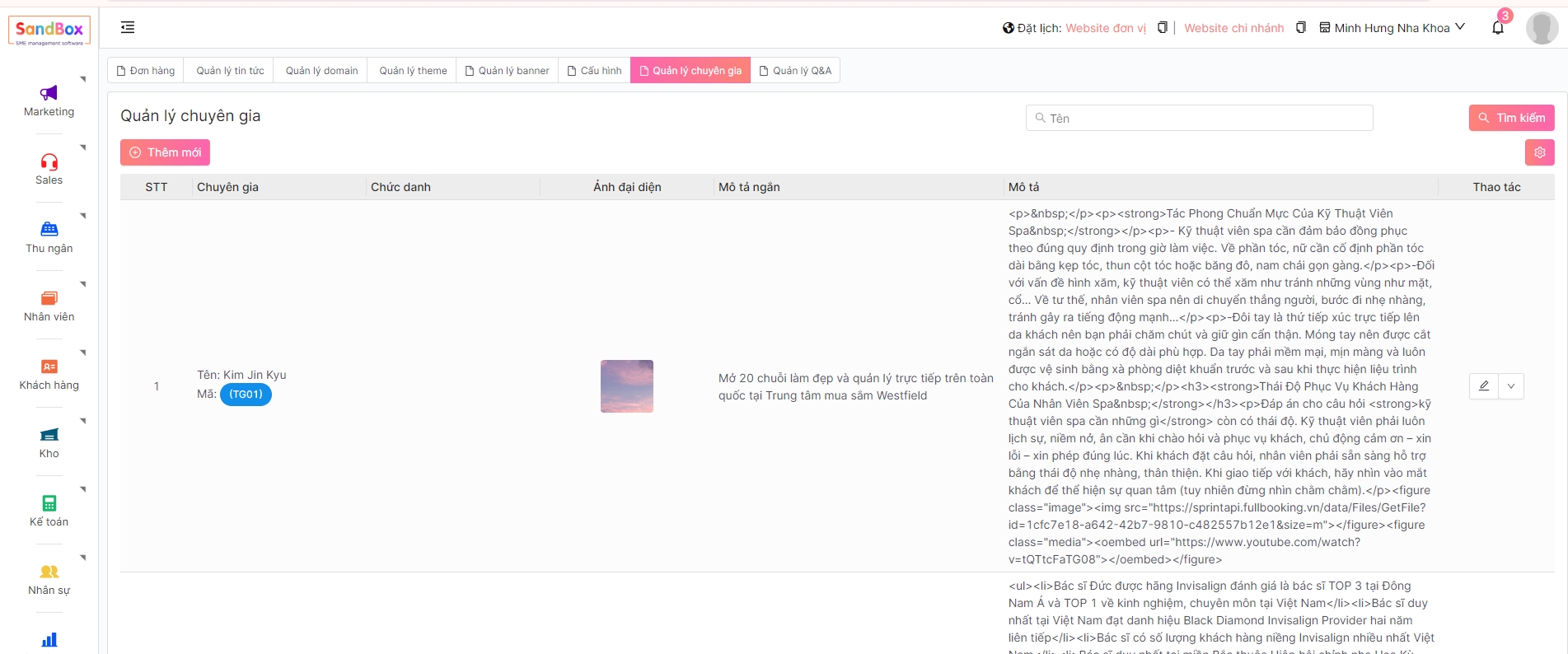 Truy cập domain Đơn vị: Menu -> Marketing>Quản lý website -> Tab Quản lý chuyển gia