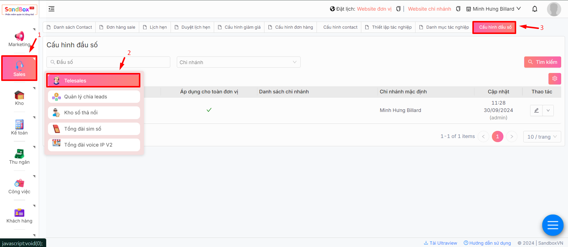 1. Sau khi đăng nhập thành công, chọn **Sales** -> chọn **Telesales** -> chọn tab **Cấu hình đầu số**