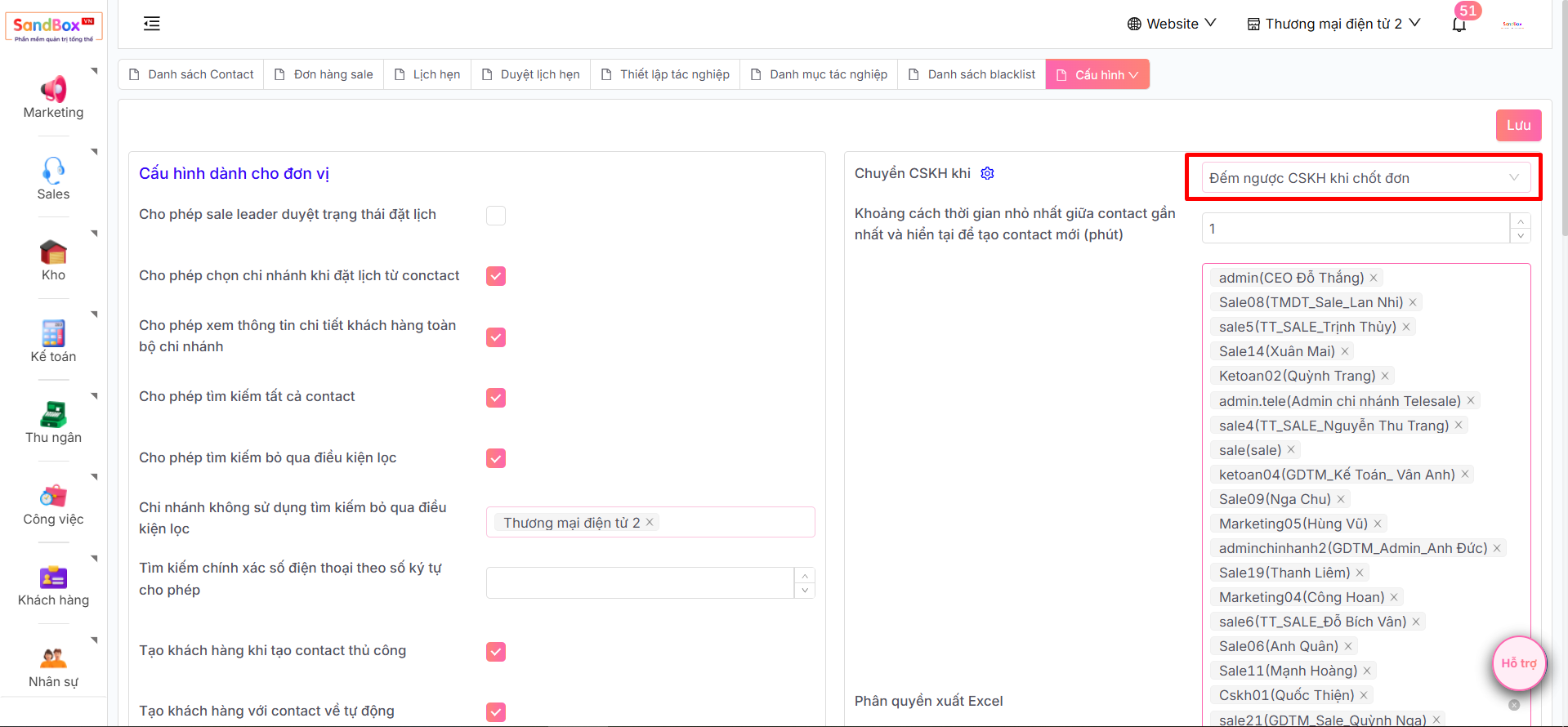 * **Đếm ngược CSKH khi chốt đơn:** khi bản ghi do sale chốt đơn thì hệ thống sẽ tự động sinh một bản ghi, gọi là: “bản ghi chăm sóc”. khi sinh bản ghi chăm sóc thì hệ thống sẽ chạy thời gian trong mục thiết lập tác nghiệp + với thời điểm chốt đơn thì sẽ sinh bản ghi chăm sóc.