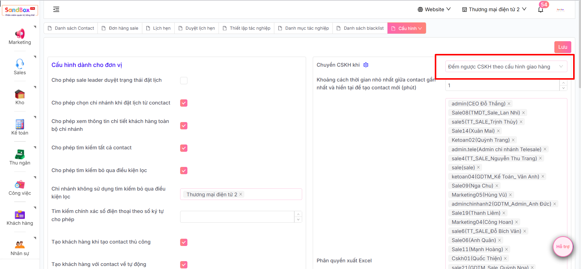 1. Đăng nhập tài khoản **Admin ->  sale -> telesales -> tab cấu hình**.