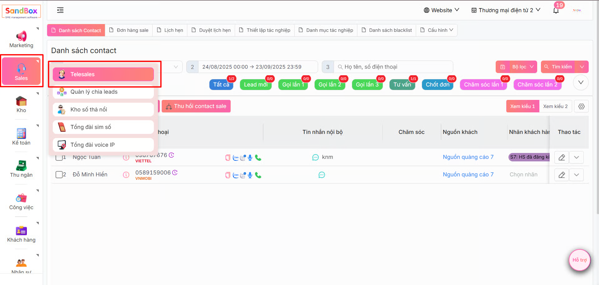 1. Sau khi đăng nhập thành công, tại thanh menu, chọn **Sales → Telesales**&#x20;