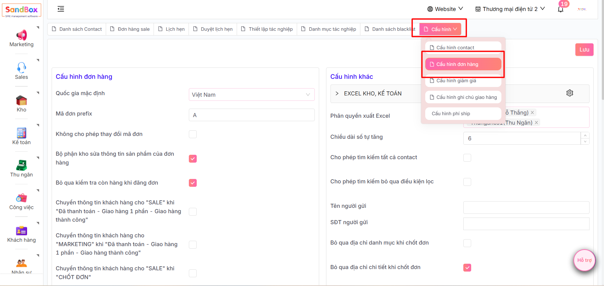 2. Sau đó chọn **Cấu hình → Cấu hình đơn hàng**&#x20;