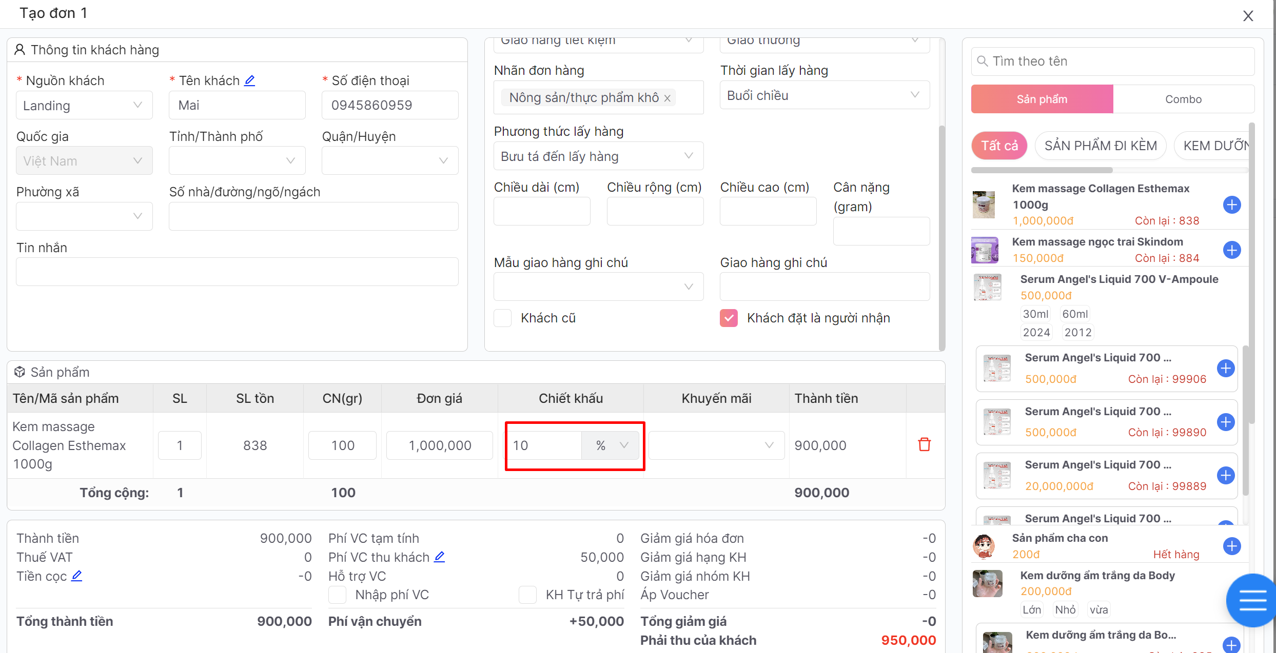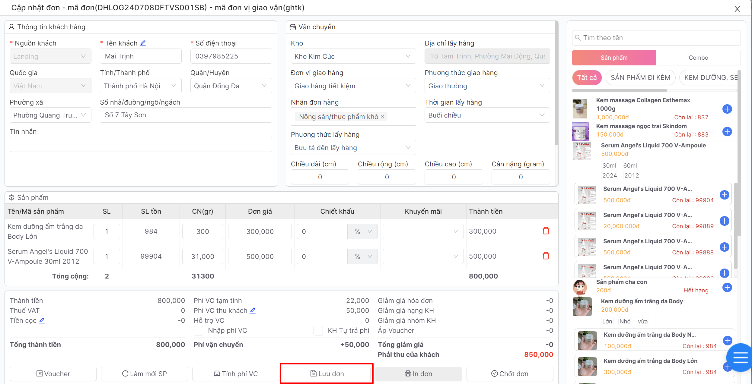 6. Nhấn vào nút <img src="https://46536393-files.gitbook.io/~/files/v0/b/gitbook-x-prod.appspot.com/o/spaces%2FKnaMljuquxKOnflZEqLy%2Fuploads%2Fn3z0JKAHS73hv58SuZir%2Fimage.png?alt=media&#x26;token=a2f75664-6156-497c-a312-5bdfda818525" alt="" data-size="line">Phí VC thu khách để thêm phí vận chuyển khách hàng phải trả