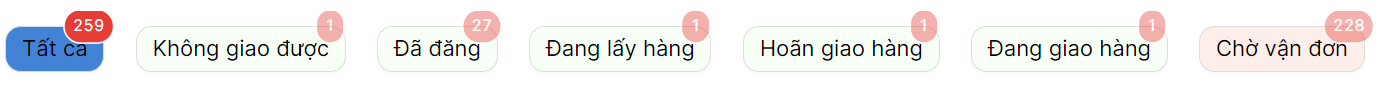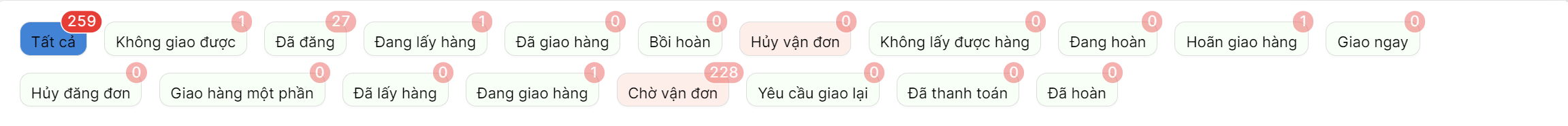 * **Tìm kiếm theo tab trạng thái:** có thể tìm kiếm theo các trạng thái Tất cả, không giao được, đã đăng, đang lấy hàng, đã giao hàng, bồi hoàn, hủy vận đơn, không lấy được hàng, đang hoàn, hoãn giao hàng, giao ngay, hủy đăng đơn, giao hàng một phần, đã lấy hàng, đang giao hàng, chờ vận đon, yêu cầu giao lại, đã thanh toán, đã hoàn