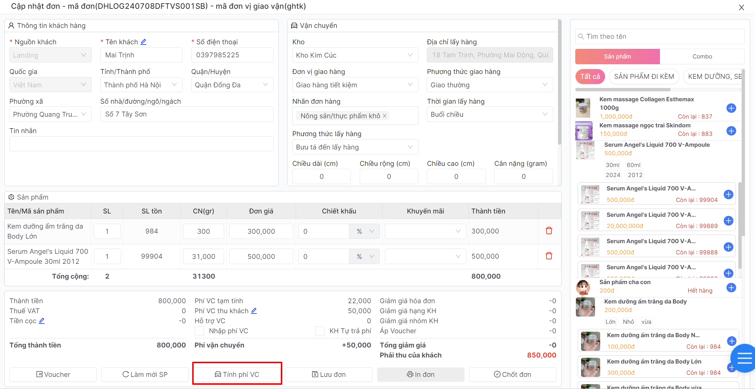 9. Chọn nút **Tính phí VC** khi thay đổi sản phẩm, thay đổi địa chỉ giao hàng, thay đổi bên giao vận,...