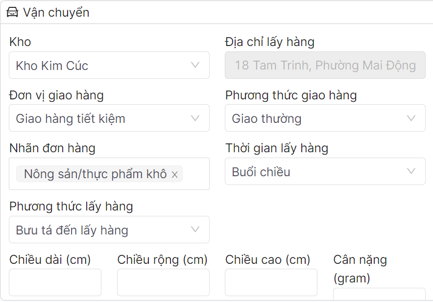 * Địa chỉ lấy hàng sẽ tự động hiển thị khi chọn kho