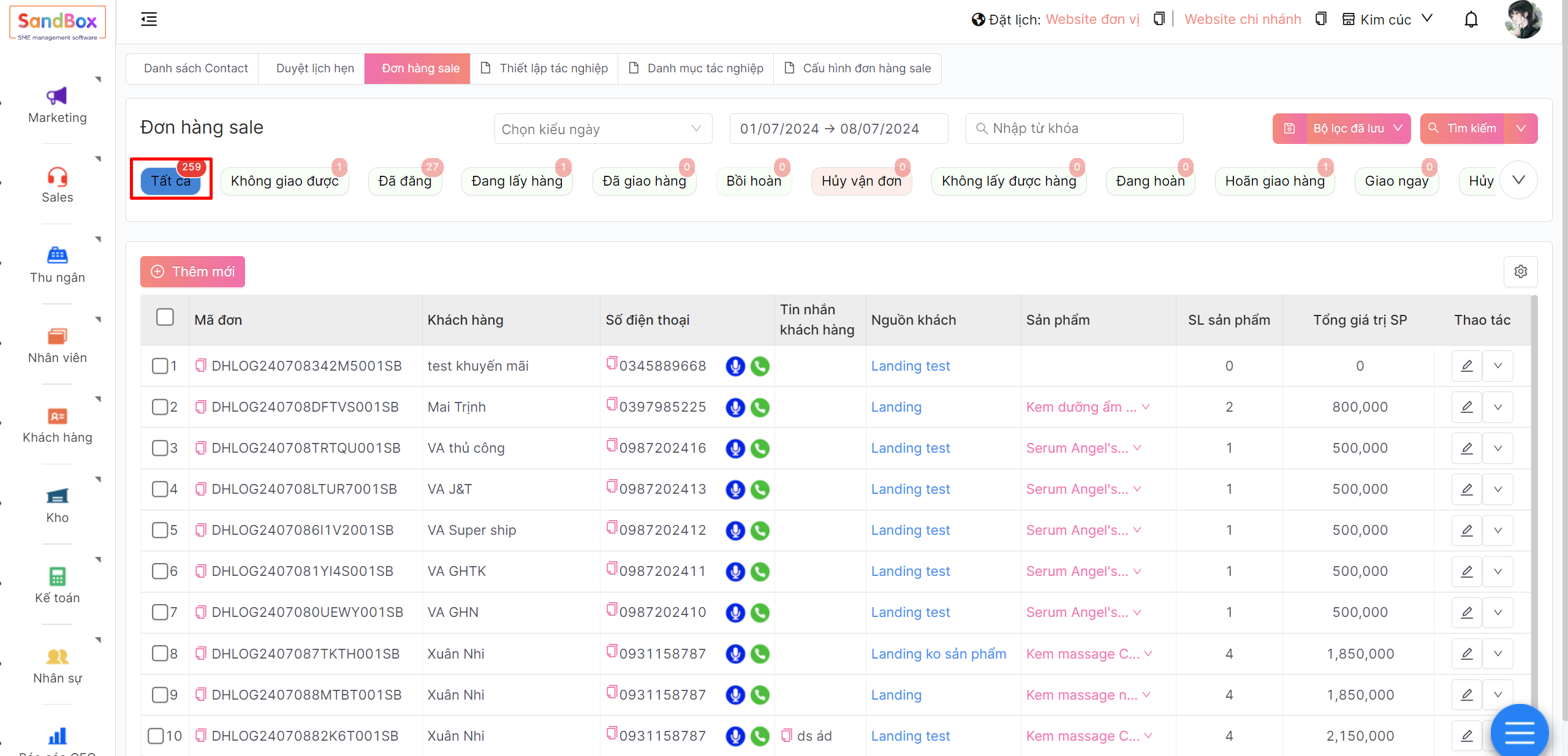 Có thể xem thông tin tất cả đơn hàng bằng cách ân vào nút **Tất cả** sẽ hiển ra những đơn chưa chốt cũng như những đơn đã chốt đơn