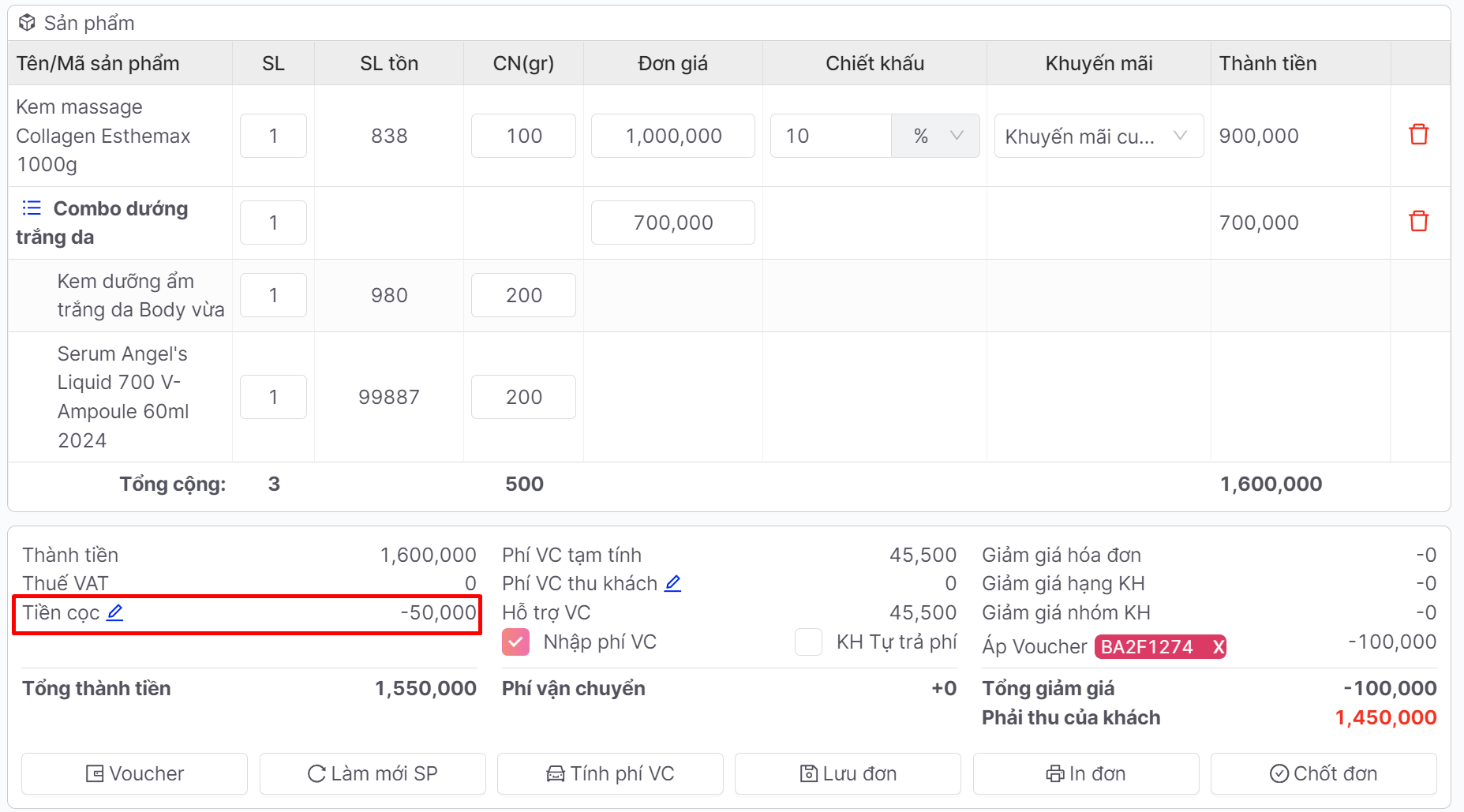 5. Để thêm cọc cho hóa đơn nhấn nút <img src="https://46536393-files.gitbook.io/~/files/v0/b/gitbook-x-prod.appspot.com/o/spaces%2FKnaMljuquxKOnflZEqLy%2Fuploads%2F6wQdtdyGLfYZy4mV29QF%2Fimage.png?alt=media&#x26;token=6b6fbfe6-89fe-430a-ae3d-3e7f1f28aac6" alt="" data-size="line">tiền cọc, sau đó nhập giá trị tiền đặt cọc mà khách hàng muốn cọc trước