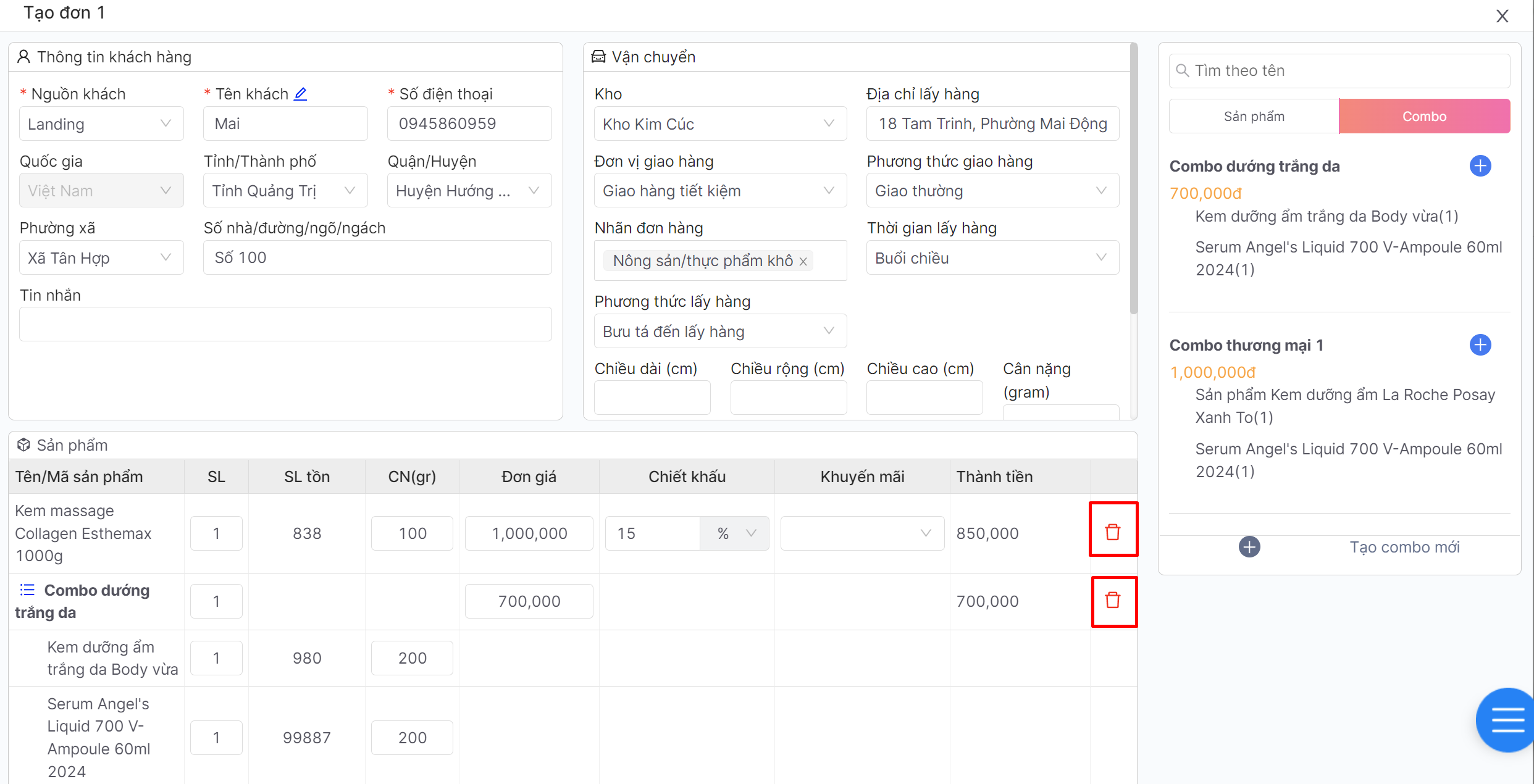 3. Sau khi thêm sản phẩm, combo vào đơn, nếu muốn xóa nhấn vào biểu tượng **Xóa** tại sản phẩm, combo