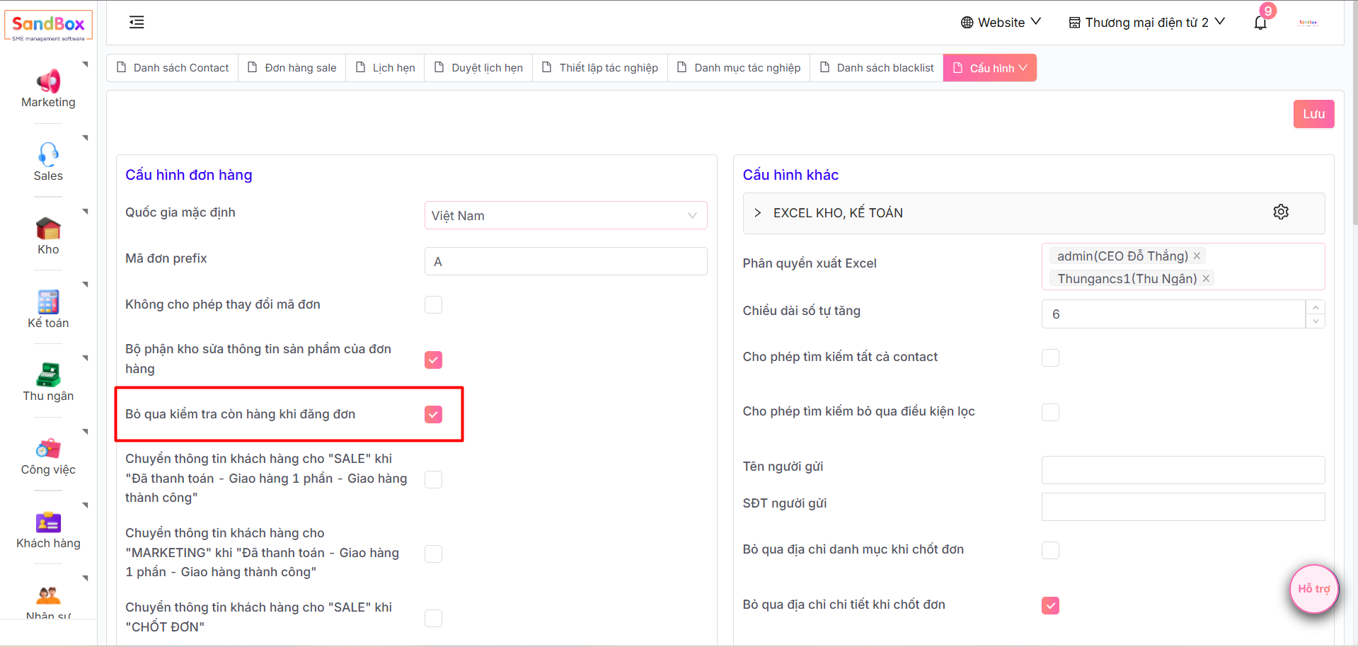 Chọn **Cấu hình đơn hàng**, tích chọn **Bỏ qua kiểm tra còn hàng khi đăng đơn**. Sau đó, bấm **Lưu** để lưu lại thông tin.&#x20;