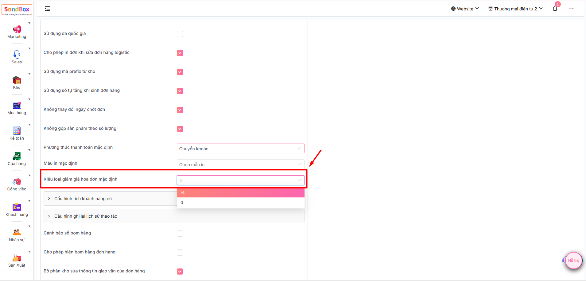 # 2.1.25 Cấu hình mặc định đơn vị giảm giá hóa đơn (đồng hoặc %)