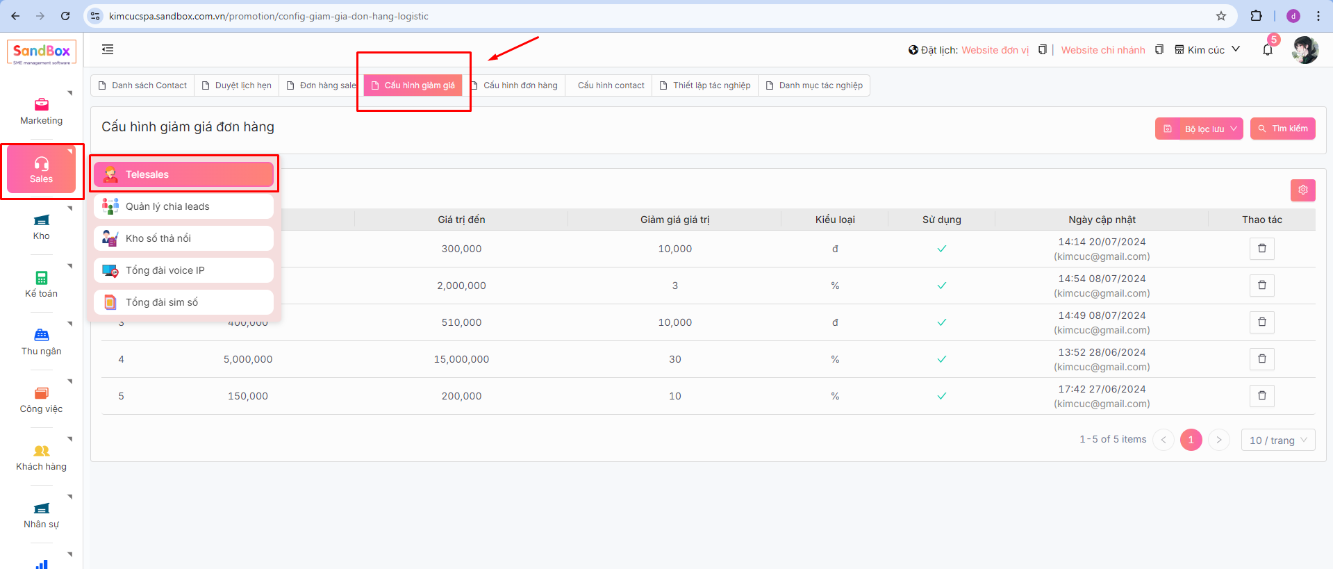 Ở thanh menu chọn **Sale -> Telesales -> Cấu hình giảm giá**