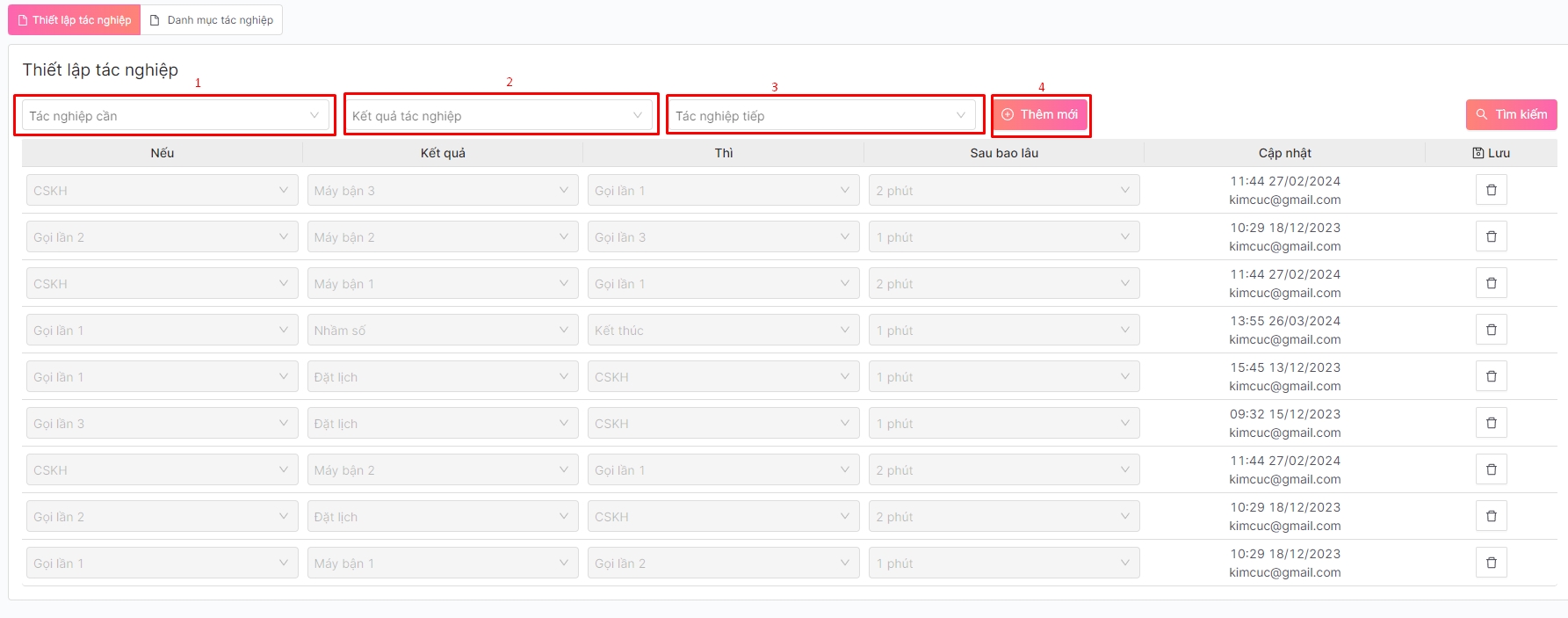 Menu -> Sales -> Telesales -> tab Thiết lập tác nghiệp
