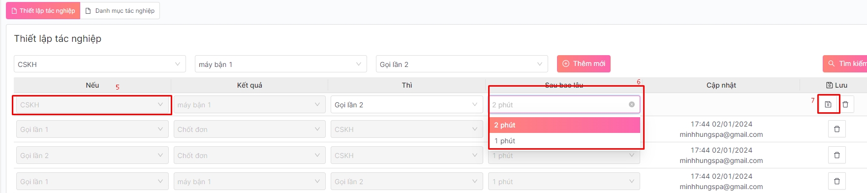 Tại bản ghi này anh/chị lựa chọn thời gian chuyển từ tác nghiệp cần đến tác nghiệp tiếp (6).