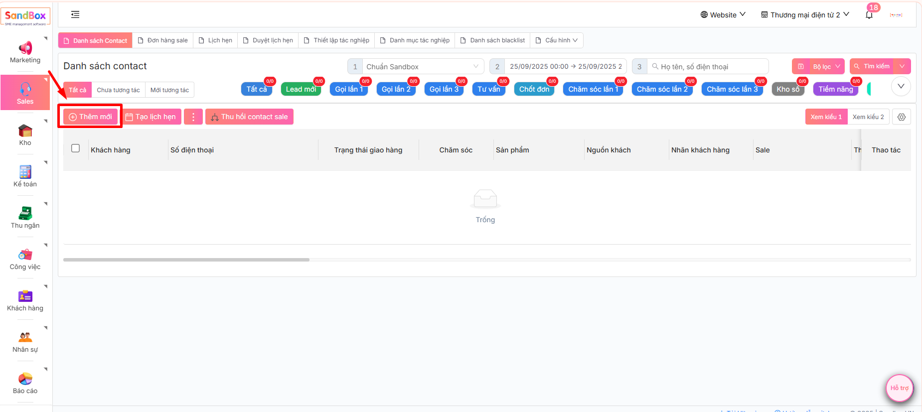 3. Ở thanh menu chọn **Sale -> Telesales -> Danh sách contact**\