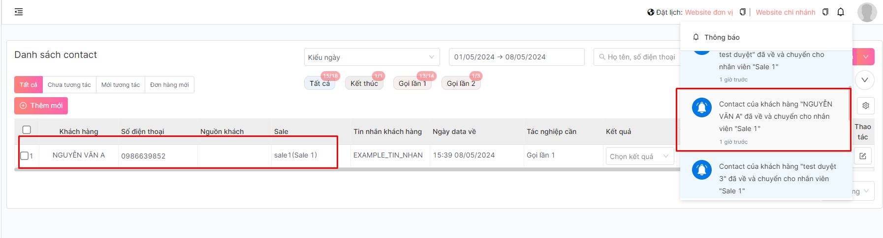 Sau khi phân bố số cho sale,  nhân viên sale sẽ nhận được thông báo  contact . Click vào thông báo sẽ điều hướng đến contact đó&#x20;