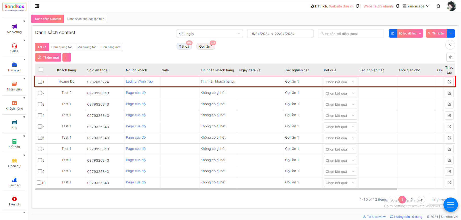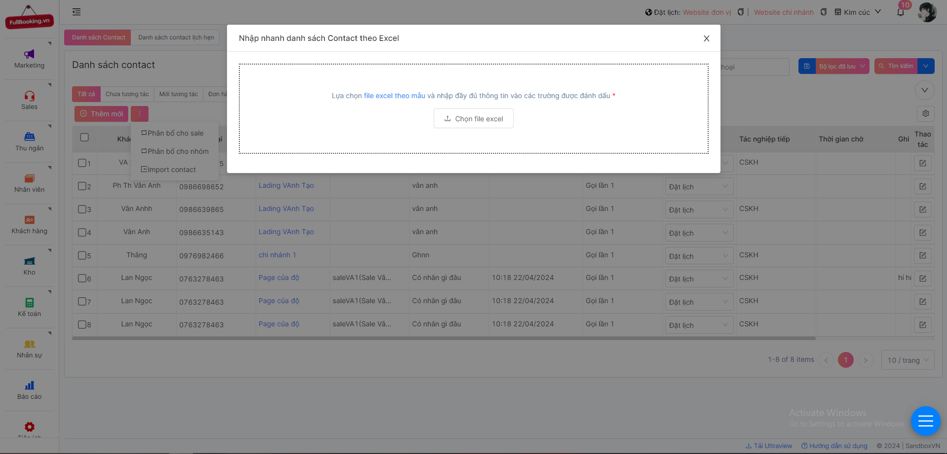 **Lưu ý:** Chỉ Admin tổng, admin chi nhánh và quản lý sale mới có thể nhìn thấy tất cả các contact và phân bổ được cho nhóm