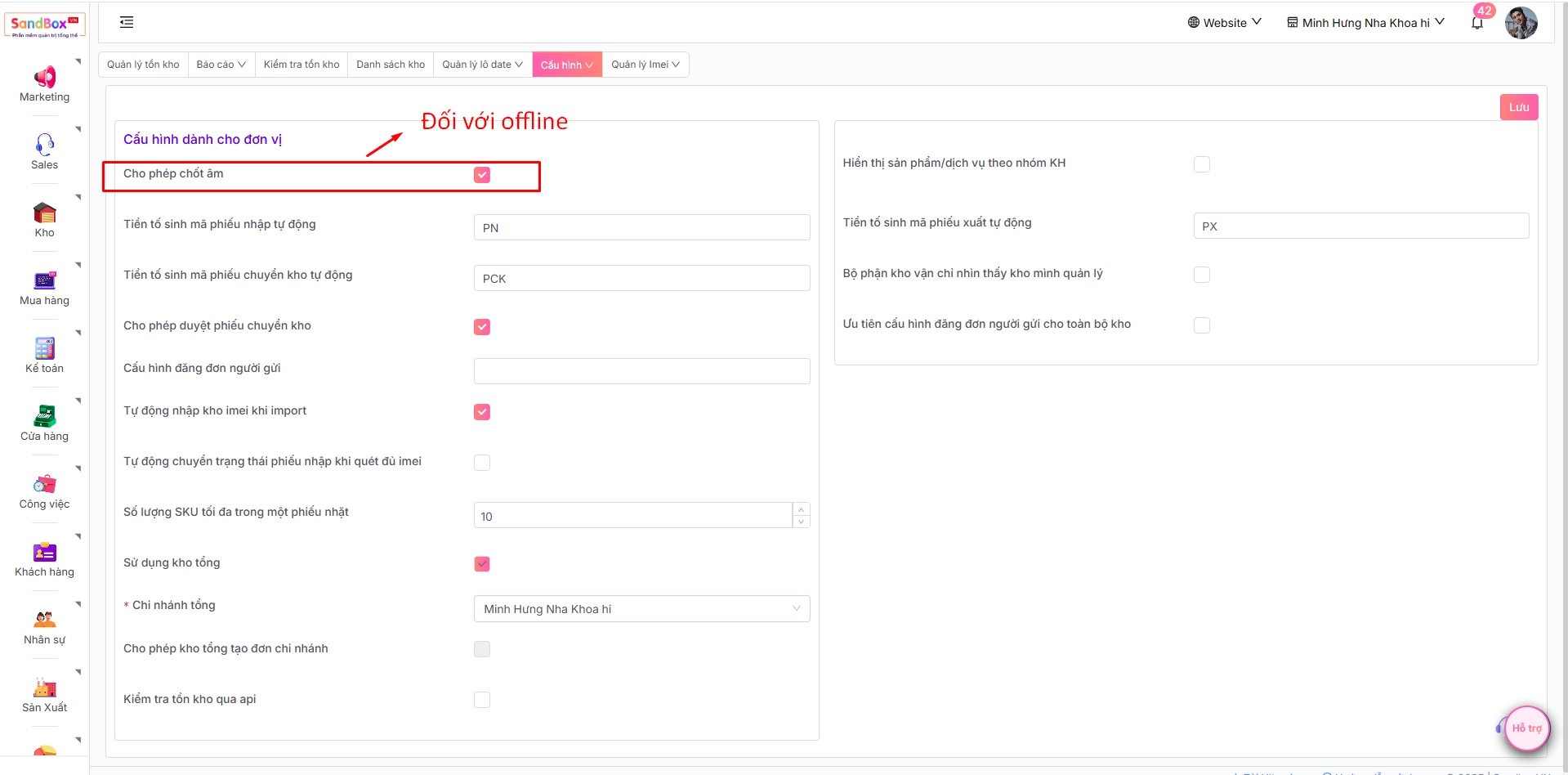 * Đối với offline, anh/chị chọn **cấu hình** - **cấu hình kho** và tích chọn "**Cho phép chốt âm**"