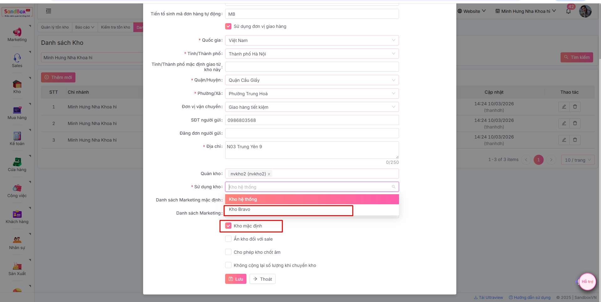 ***Lưu ý:** Khi sử dụng kho Bravo phải tích “Cho phép chốt âm” do: kho hệ thống và kho Bravo được quản lý tách biệt, nếu kho hệ thống hết số lượng nhưng kho Bravo vẫn còn mà không tích “Cho phép chốt âm” thì không thể chốt đơn.)*