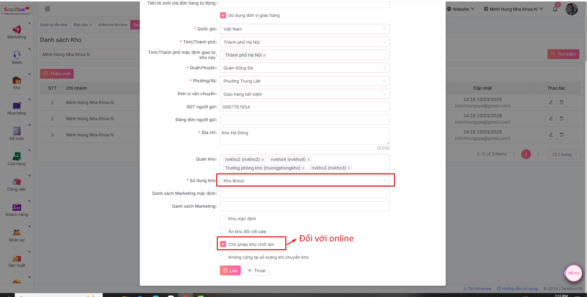 * Đối với online, Anh/chị vào kho muốn liên kết kho Bravo, chọn chỉnh sửa tại cột Thao tác tại trường “**Sử dụng kho**” chọn Kho Bravo và tích chọn “**Cho phép chốt âm**”.