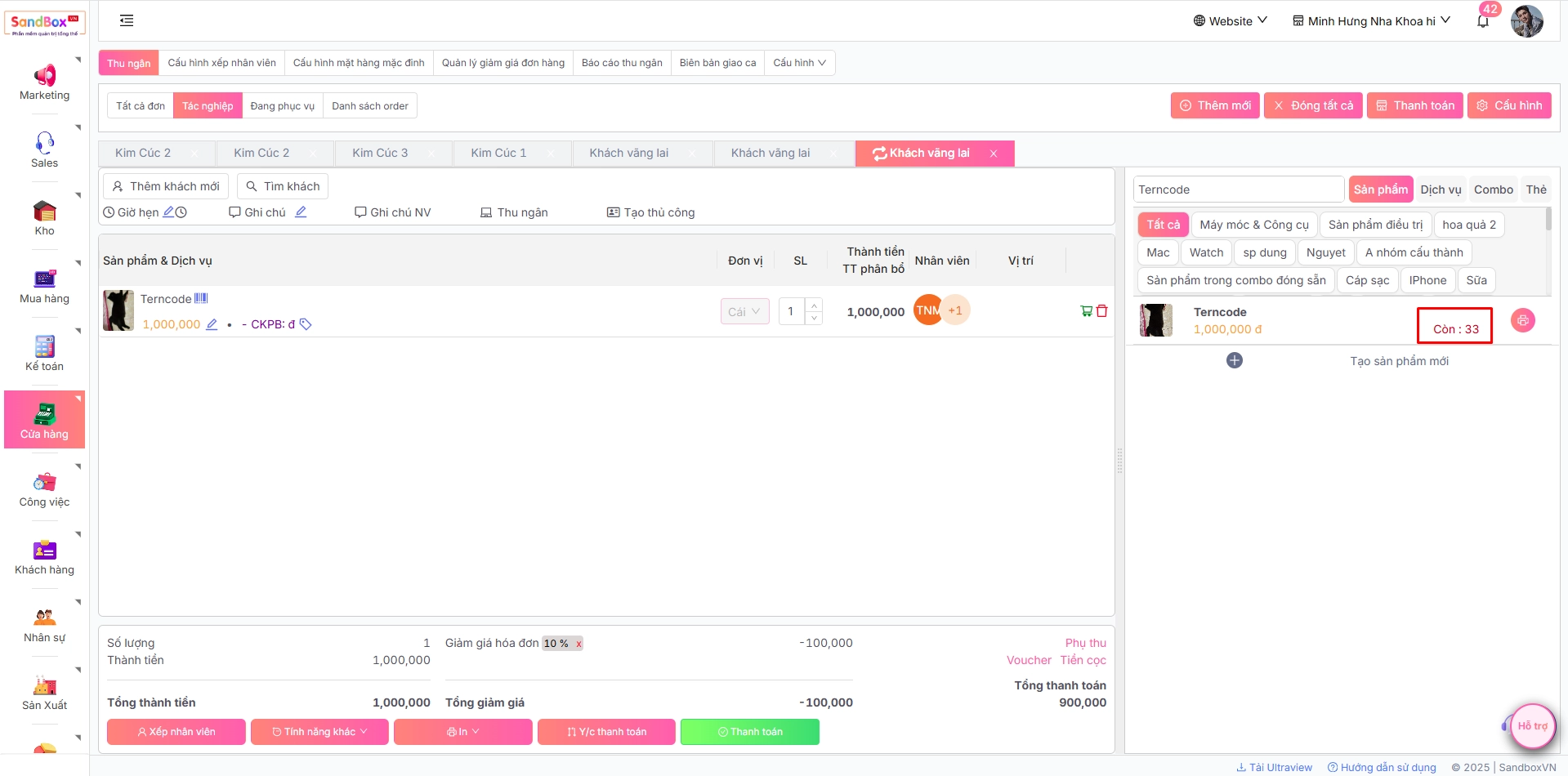 Thực hiện liên kết kho Bravo bằng cách khởi tạo sản phẩm trên hệ thống SandboxVN, đảm bảo mã sản phẩm trùng khớp với mã sản phẩm trên hệ thống Bravo. Sau khi liên kết thành công, tại danh sách sản phẩm trên màn hình tạo đơn hàng (Online và Offline), tồn kho của sản phẩm sẽ được hiển thị theo số liệu tồn kho từ hệ thống Bravo.