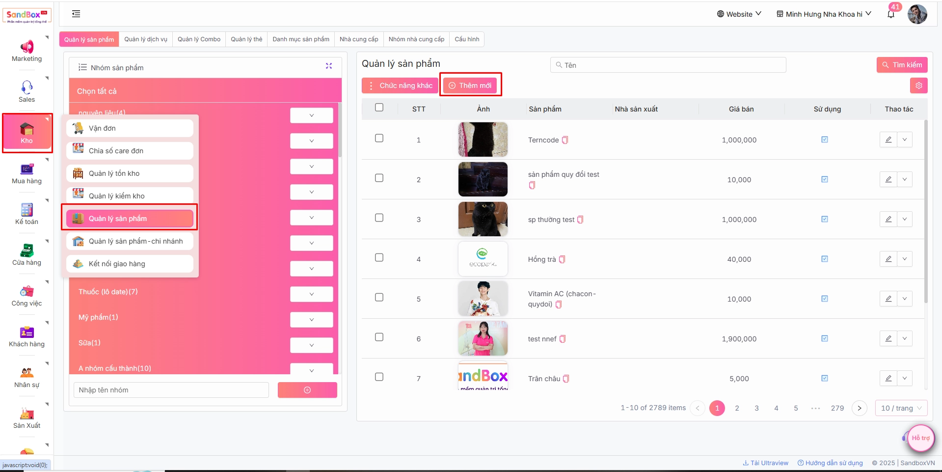 Chọn menu **Kho** => **Quản lí sản phẩm,** để tạo mới sản phẩm ấn nút **Thêm mới**