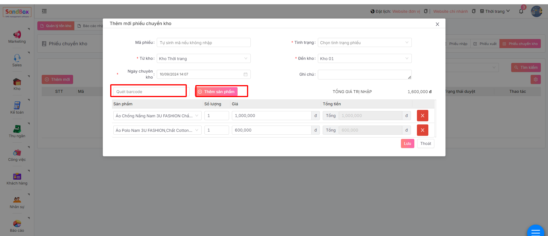 3. Sau khi hoàn thành thông tin phiếu chuyển kho ấn **Lưu** thông báo thêm phiếu chuyển kho thành công.