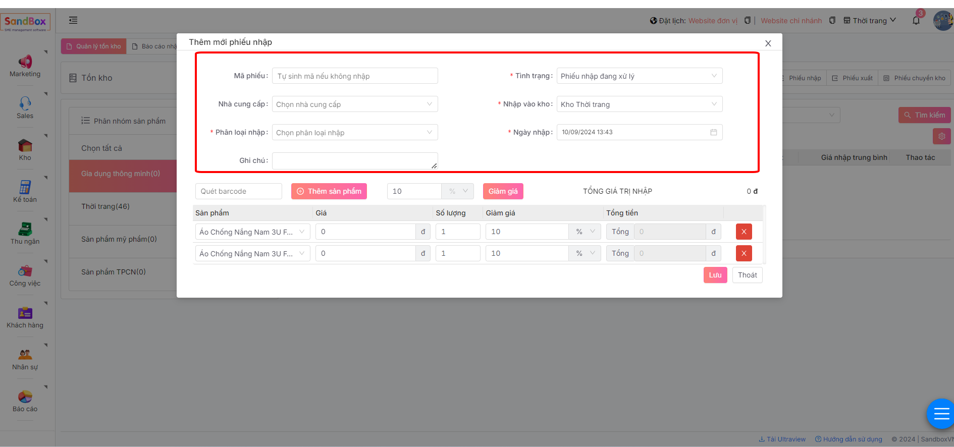 * **Phân loại nhập**: Các loại nhập kho, có thể chọn "Nhập đóng gói", "Nhập trả lại từ khách" hoặc "Nhập mua từ NCC",...