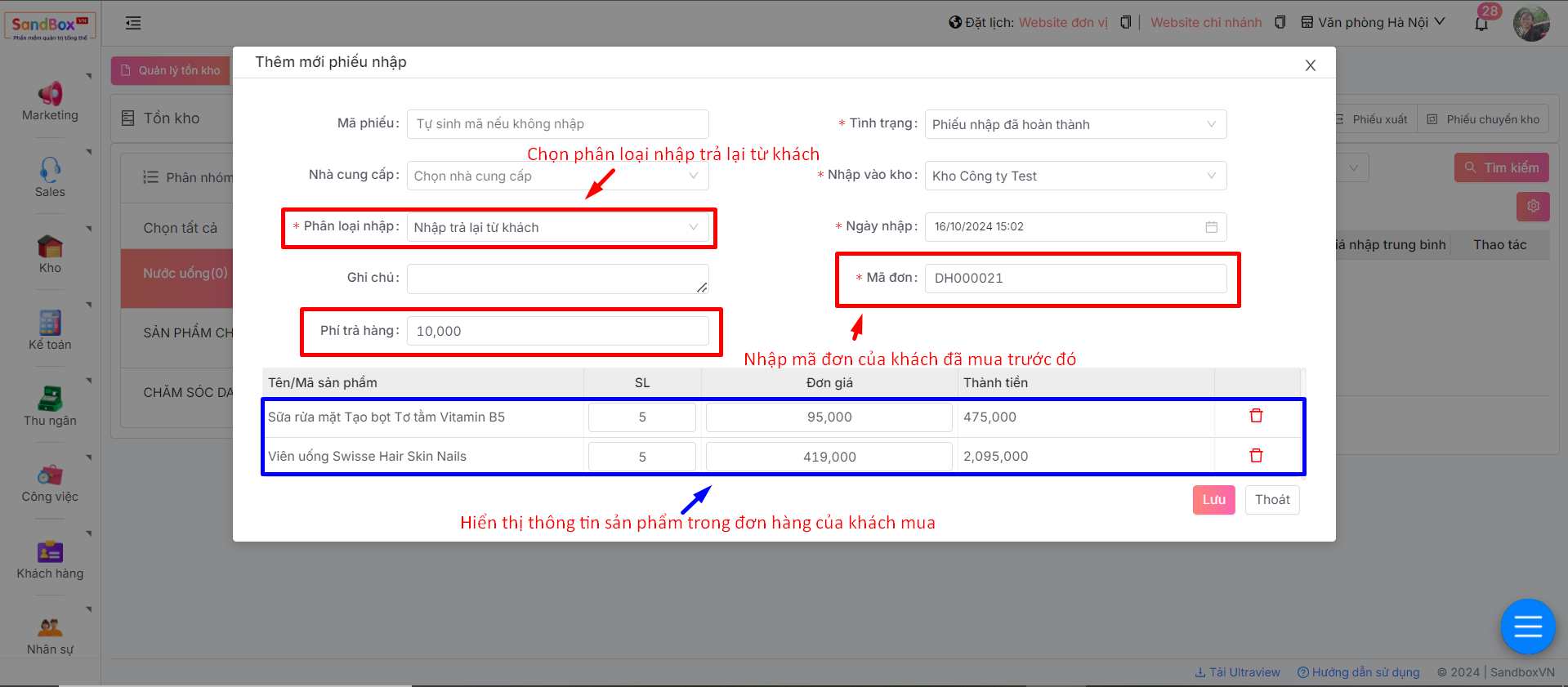 4. Trường hợp cần nhập hàng khách trả lại vào kho, thực hiện các thao tác nhập kho như sau: